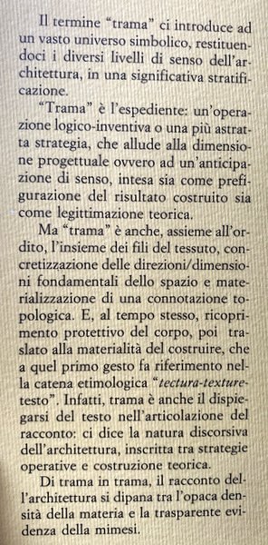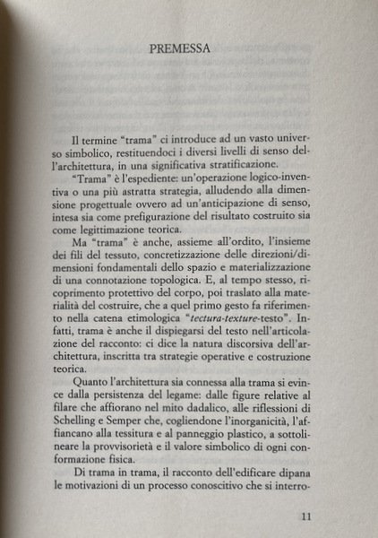 Il termine "trama" ci introduce ad un vasto universo simbolico, restituendoci i diversi livelli di senso dell'architettura, in una significativa stratificazione. "Trama" è l'espediente: un'operazione logico-inventiva o una più astratta strategia, che allude alla dimensione progettuale ovvero ad un'anticipazione di senso, intesa sia come prefigurazione del risultato costruito sia come legittimazione teorica. Ma "trama" è anche, assieme all'ordito, l'insieme dei fili del tessuto, concretizzazione delle direzioni/dimensioni fondamentali dello spazio e materializzazione di una connotazione tipologica. E, al tempo stesso, ricopri mento protettivo del corpo, poi traslato alla materialità del costruire, che a quel primo gesto fa riferimento nel la catena etimologica "tectura-texture-testo". Infatti, trama è anche il dispiegarsi del testo nell'articolazione del racconto: ci dice la natura discorsiva dell'architettura, inscritta tra strategie operative e costruzione teorica. Di trama in trama, il racconto del l'architettura si dipana tra l'opaca densità della materia e la trasparente evidenza della mimesi.