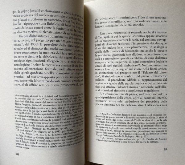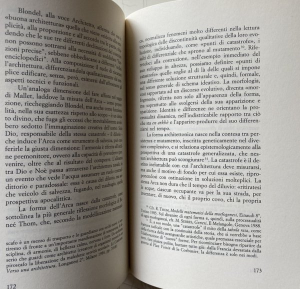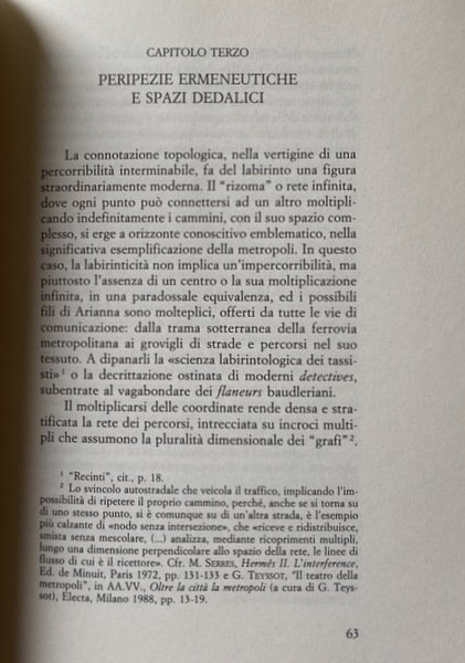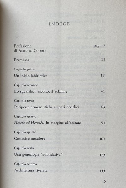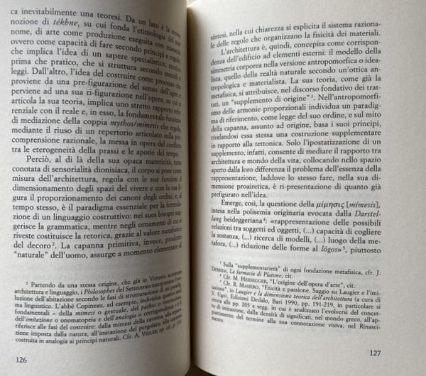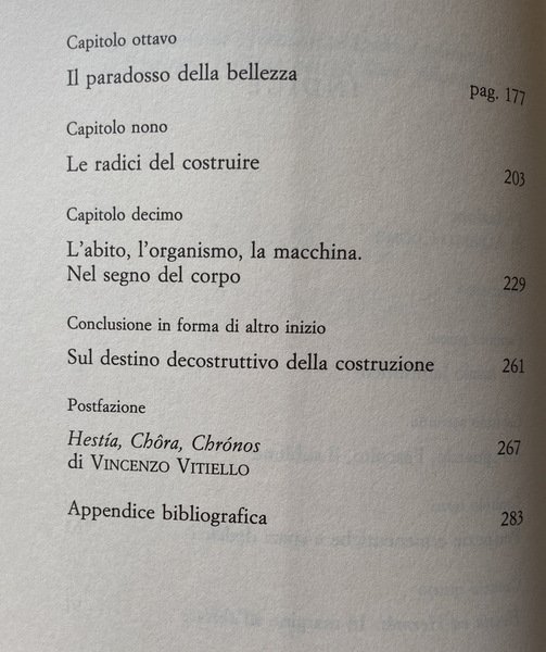 Soggetti: Architettura, Urbanistica, Composizione architettonica, Filosofia degli spazi, Spazio, Teorie architettoniche, Bellezza, Arte, Belle arti, Abitare, Corpo, Abito, Organismo, Macchina, Costruire, Scienza delle costruzioni, Decostruire, Sublime, Ermeneutica, Hestia, Hermes, Metafore, Studi culturali, Bibliografia, Riferimento, Saggistica, Libri Vintage Fuori catalogo, Città, Metropoli, Labirinti, Recinti, Trasporti, Traffico, Leon Battista Alberti, De Re Aedificatoria, Edifici, Arendt, Mimesi, Estetica, Stili architettonici, Topos, Topologia, Hegel, Fenomenologia, Luoghi, Viollet-le-Duc, Le Corbusier, Entretiens, Joseph Rykwert, de Quincy, Durand, Imitazione, Winckelmann, Classicismo, Modernità, Casa, Teoretica, Aleph, Beit, Nut, Geb, Gaston Bachelard, Palazzo di Cnosso, Panorama, Benjamin, Parigi, Broadacre City, Frank Lloyd Wright, Plan Obus, Algeri, Berlino, Blondel, Mallet, Arca, Salvezza, Grembo, Catastrofe, Plan Voisin, Thom, Avanguardie, Tabula rasa, Tekhne, Vitruvio, Settecento, Ottocento, Philosophes, Laugier, Fagiolo, Terragni, Dedalo, Arké, Architecture, Urbanism, Architectural Composition, Philosophy of Spaces, Space, Architectural Theories, Beauty, Art, Fine Arts, Living, Body, Dress, Organism, Machine, Build, Construction Science, Deconstruct, Sublime, Hermeneutics, Metaphors, Cultural Studies, Bibliography, Reference, Non-fiction, Out of print books, Cities, Metropolis, Labyrinths, Fences, Transport, Traffic, Buildings, Mimesis, Aesthetics, Architectural styles, Topology, Phenomenology, Places, Imitation, Classicism, Modernity, House, Theoretics, Knossos palace, Paris, Algiers, Berlin, Ark, Salvation, Womb, Catastrophe, Avant-gardes, Vitruvius, Eighteenth century, Nineteenth century, General Works, Opere generali