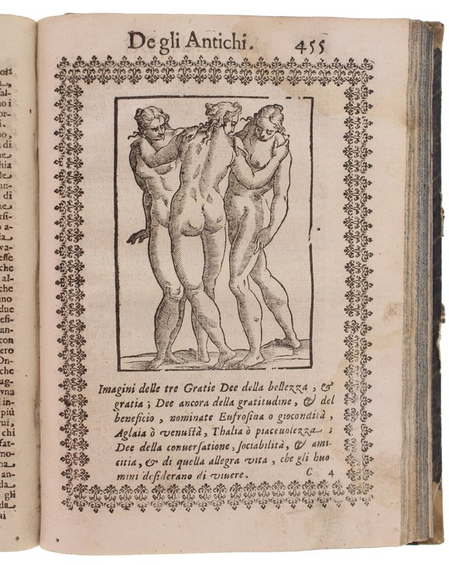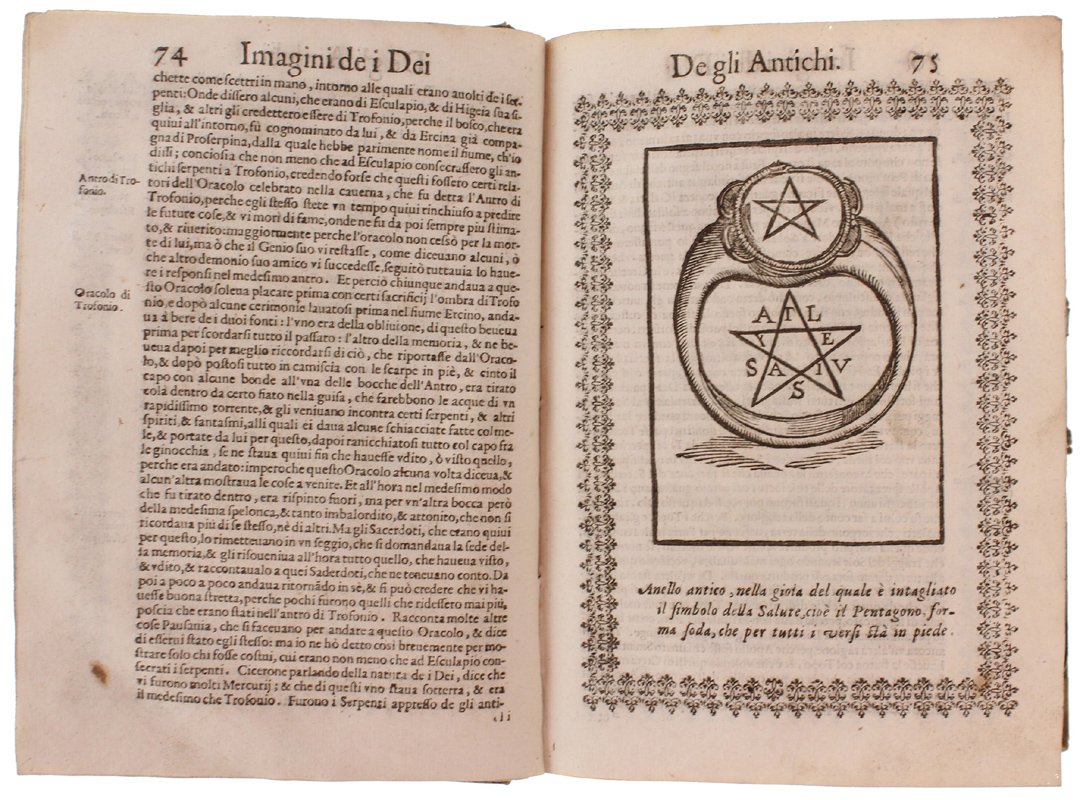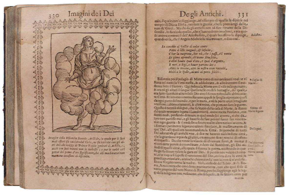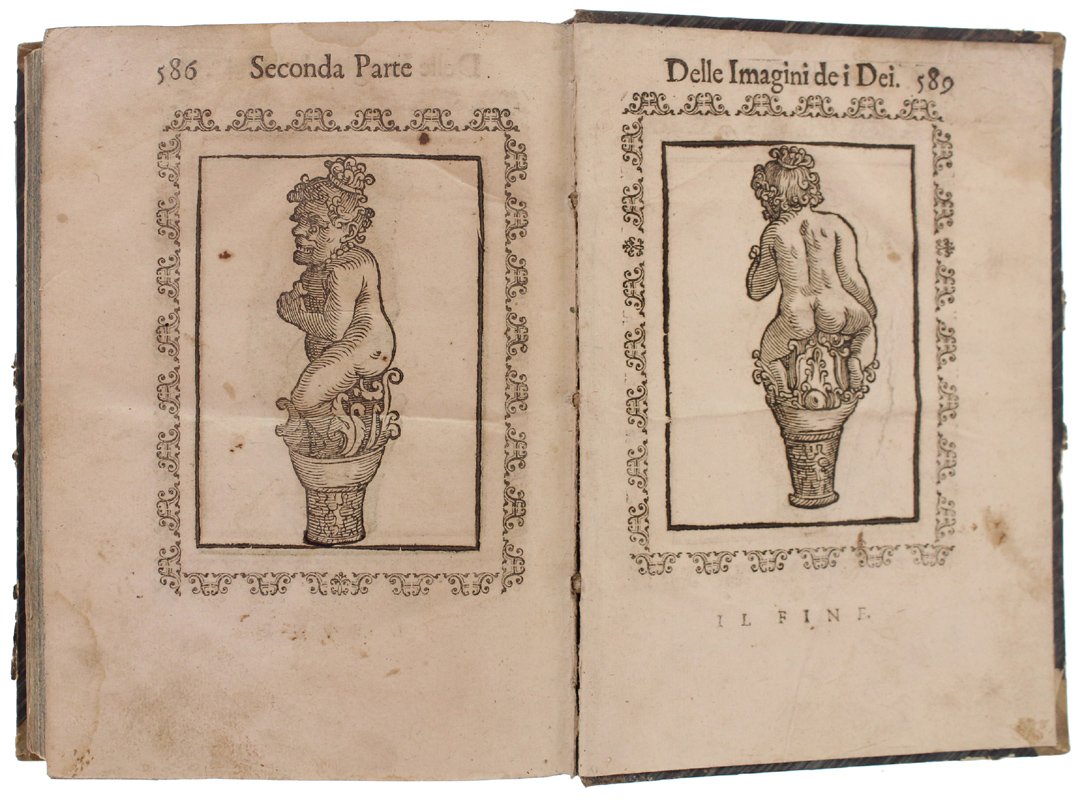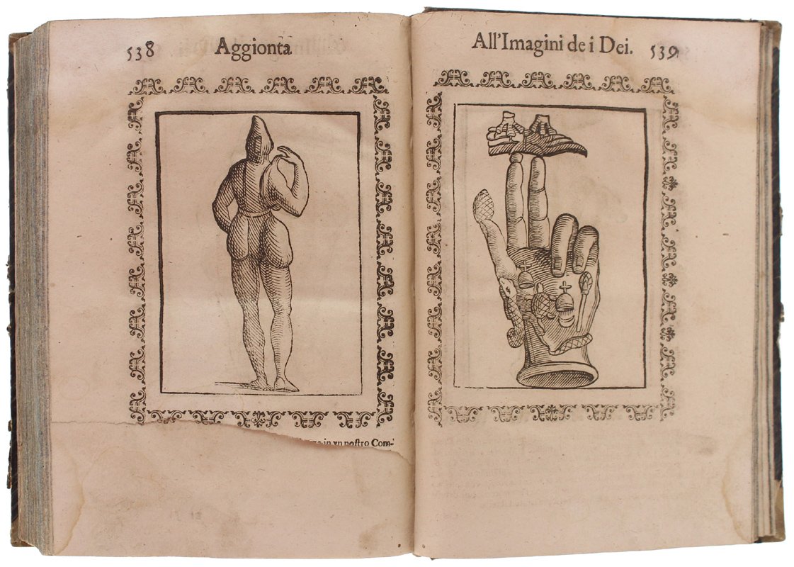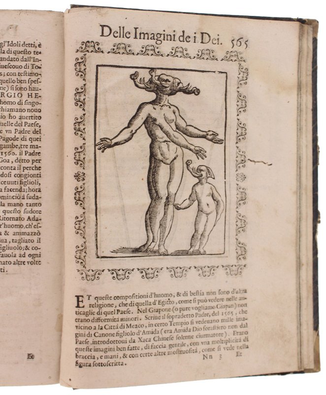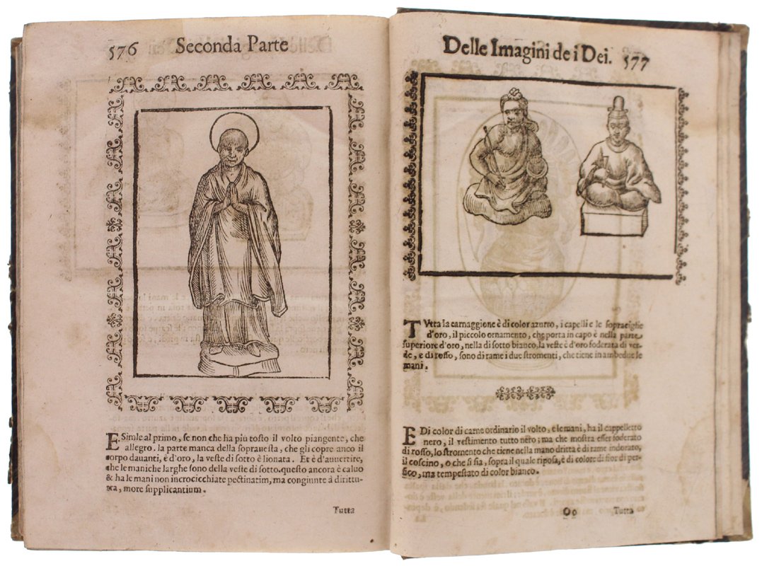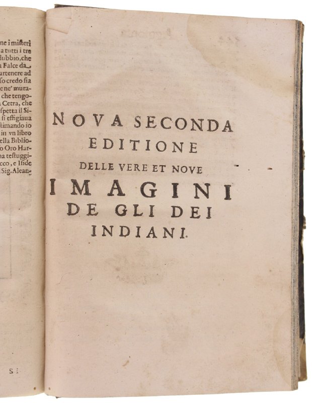 (Codice AN/3518) In 4° antico (22x16 cm) (30)589 pp. Edizione illustrata con 244 bellissime incisioni xilografiche entro cornice + 2 fuori testo ripiegate. Capilettera figurati, testatine, 3 grandi finalini. Esemplare privo di frontespizio e colophon: la data di edizione si ricava dalle 2 dediche del Tozzi: a Francesco Drago e a Piero Buarno (1 novembre 1614). L'opera del Cartari è seguita da 2 aggiunte di Lorenzo Pignoria: le "Annotationi" (p.461) e una "nova seconda editione delle vere et nove imagini de gli dei indiani" (p.544) in cui si descrivono divinità atzeche e giapponesi. Tarlini marginali, ingialliture, strappetti (mancanze a 5 carte con perdita di testo), lievi aloni, macchie (inchiostro), qualche vecchio restauro. Buona legatura dell'800 in mezza tela, titolo oro, ~~~ SPEDIZIONE IN ITALIA SEMPRE TRACCIATA
