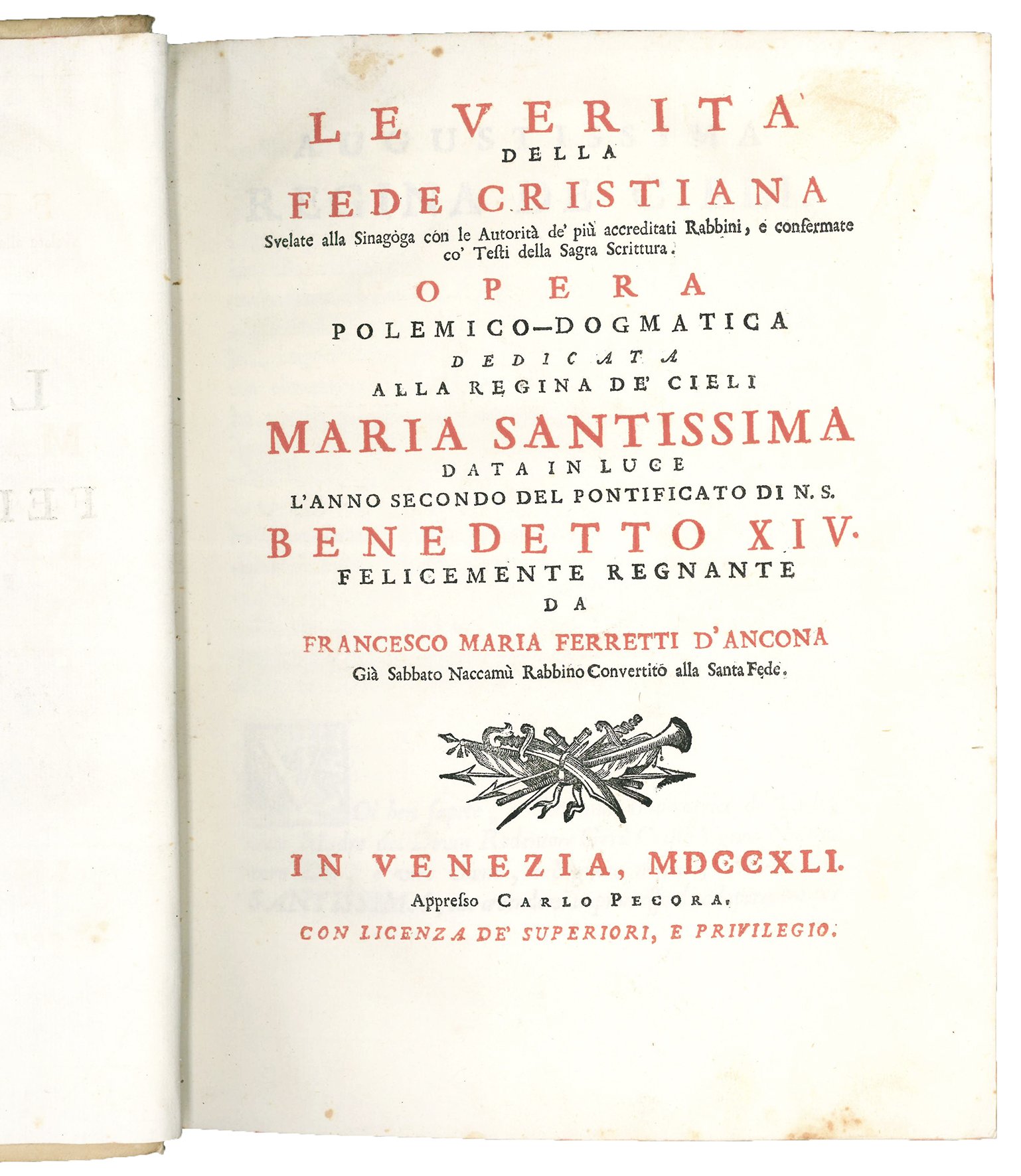 Le verità della fede cristiana svelate alla Sinagoga con le Autorità de' più accreditati Rabbini, e confermate co' testi della Sagra Scrittura. Opera polemico-dogmatica […] data in luce l'anno secondo del pontificato di N.S. Benedetto 14. felicemente regnante da Francesco Maria Ferretti già Sabbato Naccamù Rabbino Convertito alla Santa Fede