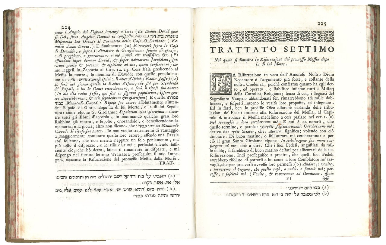 In 4to (mm. 246x182). Pp. [20 di 24], 434, [14]. Segnatura: a-c4 A- Kkk4. Mancano dall'origine le carte c2-c3. Frontespizio stampato in rosso e nero. Caratteri romani, corsivi ed ebraici. Pergamena rigida coeva con tassello e titolo in oro al dorso, tagli marmorizzati. Ottima copia. Catalogo unico, IT\ICCU\UBOE\021539.