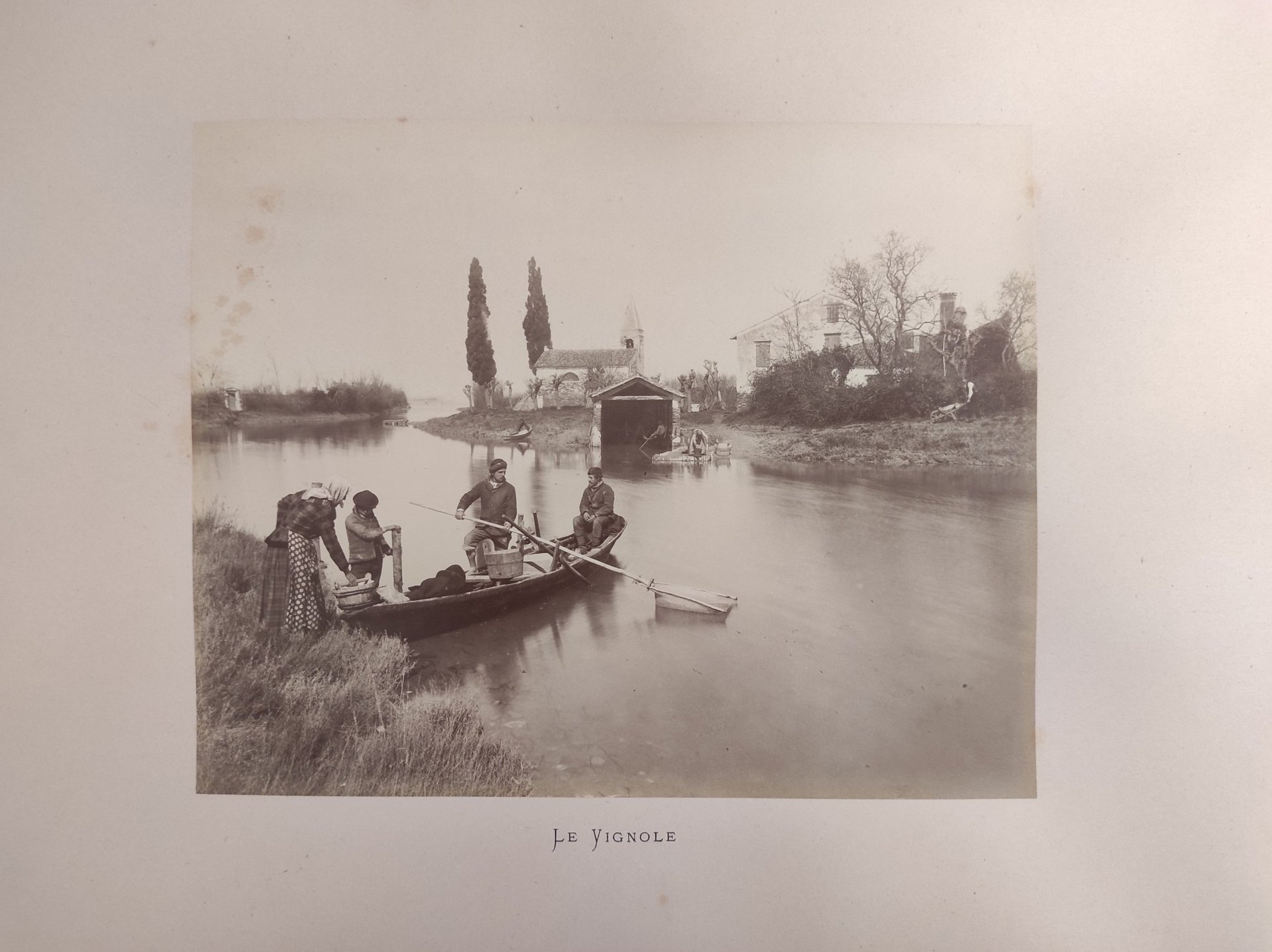 Facente parte dell'album "Ricordo della esposizione nazionale artistica. Isole della Laguna di Venezia." Cartoncino leggermente ondulato. fotografia ai sali d'argento applicata su cartoncino cm. 19 x 24 Buono (Good) Buon es., brunitura al cartoncino di supporto, macchie.