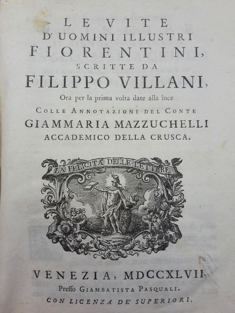 In-4° (cm. 24), legatura coeva in m. pergamena; pp. 36 CII [2 bb] in ottimo stato. Prima edizione curata dal Mazzucchelli delle Vite del Villani in volgare. «Edizione correttissima. Filippo Villani collo scrivere questa Vite ci ha dato il primo esempio di Storia Letteraria Patria» [Moreni II, 458]. L'opera risulta di fondamentale importanza per la conoscenza del Trecento fiorentino. Esemplare molto buono. (SP1)