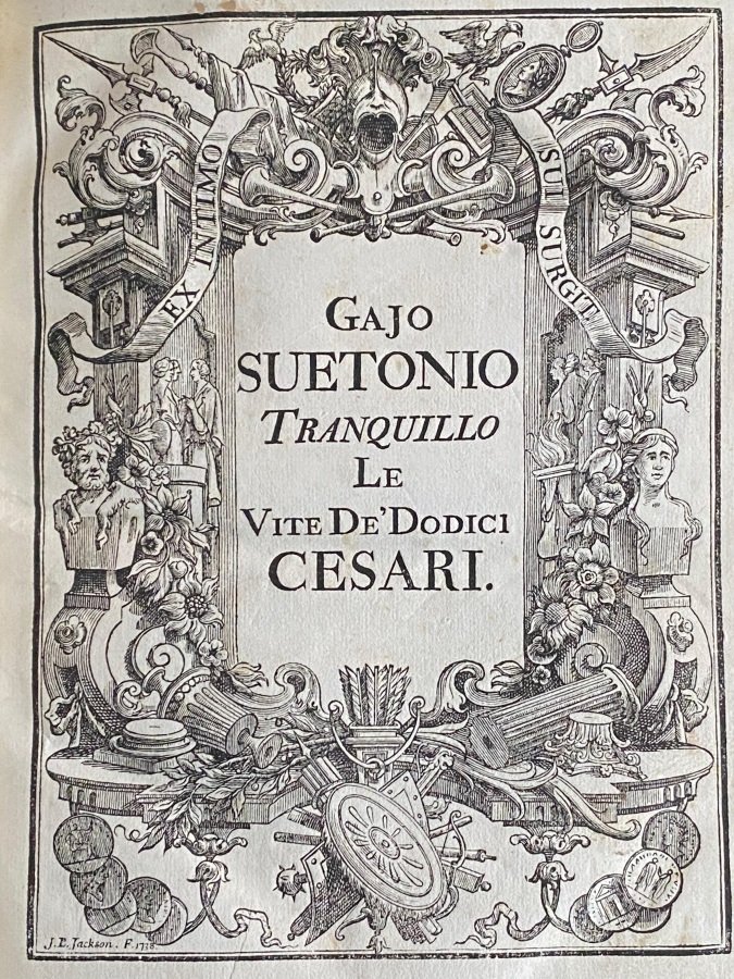 In-8° (cm. 23,5), legatura successiva in piena pelle bruna, dorso a nervi con titolo e filetti in oro (lievissime tracce d'uso); pp. XIX [1b] 377 [1] con 12 ritratti xilografici degli imperatori nel testo e 1 suggestiva tavola incisa in xilografia da <span style="font-size: 13.333333px;">John Baptist Jackson</span> all'antiporta con il titolo inquadrato da una ricca cornice figurata; piccola veduta al frontespizio con titoli in rosso e nero; capilettera e finalini sempre xilografici (alcune fioriture sparse, piccoli forellini di tarlo a poche carte, sporadiche note anticamente manoscritte). Interessante edizione settecentesca di una importante traduzione del Cinquecento. Buon esemplare. (NQ9)