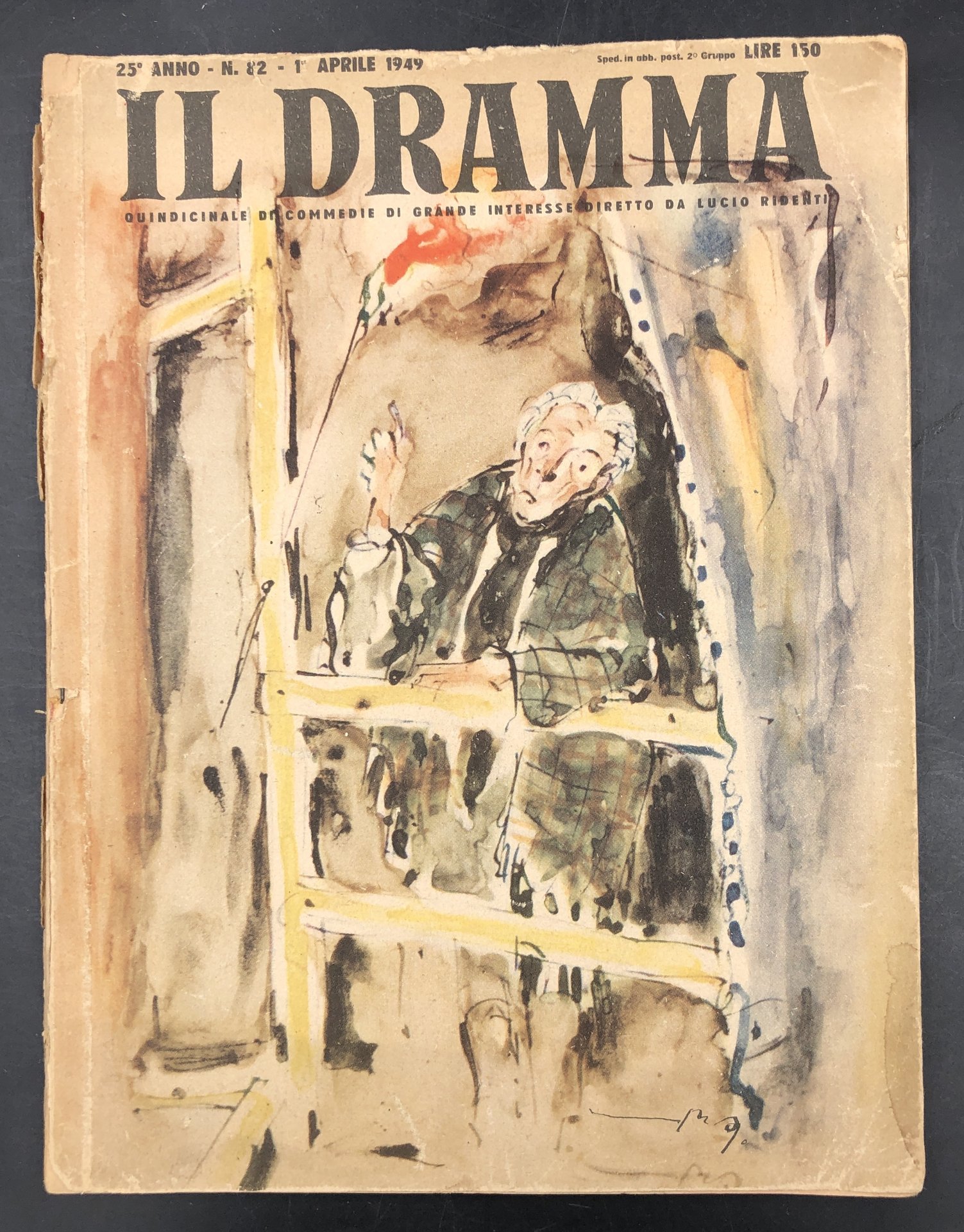 Questa commedia di De Filippo (testo in italiano; presentazione di Salvatore QUASIMODO!) occupa 20 pagine + 10 FOTO di scena in 2 tavole b.n. f.t. e secondo ICCU (che lo censisce solo alla Biblioteca civica Elio Filippo Accrocca - Cori - LT), costituisce la prima edizione a stampa. Fu rappresentato la prima volta al Teatro Nuovo di Milano l'11 dicembre 1948. Il fascicolo in-8° (cm. 24,4x18,6), è completo delle sue 58 pagine in bross. edit. (dorso mancante, piatto ant. staccato, ma l'illustrazione di cop. è integra.) ill. da Massimo QUAGLINO ("Sintesi della commedia Le voci di dentro"). Contiene inoltre una commedia di Enrico BASSANO, un atto di Glauco Di Salle, testi su altri argomenti di Lucio Ridenti, Renato Simoni ecc. e DISEGNI di Felice CASORATI, BRUNETTA, BIANCONI, WILD, ERDOES, PICASSO. Così com'è
