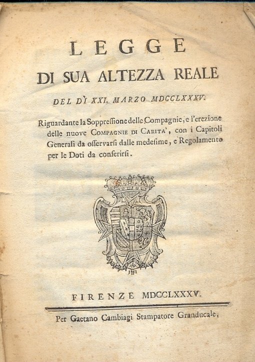 Legge di Sua Altezza Reale del di XXI marzo MDCCLXXXV, riguardante la soppressione delle Compagnie e l'erezione delle nuove Compagnie di Carità, con i Capitoli Generali da osservarsi dalle medesime e Regolamento per le Doti da conferisi.