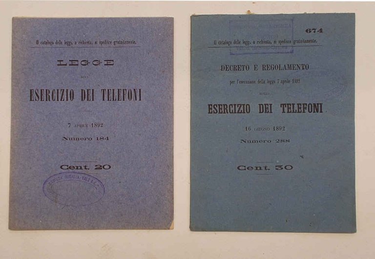 Legge sull'esercizio dei telefoni 7 aprile 1892 Numero 184. --- Decreto e regolamento per l'esercizio della legge 7 aprile 1892 sullo esercizio dei telefoni 16 giugno 1892 Numero 288.