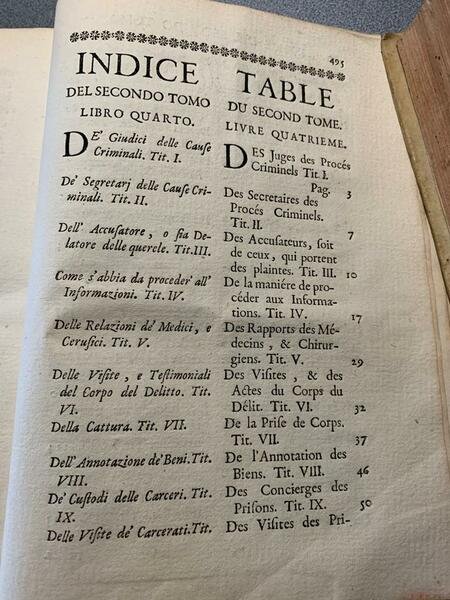 Due voll. in 8 cm. 23,1x17,9 ; pp.(2b)-480-(2b); (2b)-505-(3b); Legatura solida coeva p. pergam. rigida dorso 5 nervetti con due tasselli riquadrati con titolo e num. in lettere oro. Tagli spruzzati rossi Frontespizi con incisione calcografica stemma reale Savoia finalini xilogr. Esemplare in carta pesante a larghi margini alcune pagg. leggermente brunite uniformemente per qualità della carta.Testo su due colonne in italiano e francese. Restauro alla cuffia sup del I vol e al dorso del II vol. Spruzzo di inchiostro nero sui tagli inferiore e frontale del I vol. ma nel complesso buon esemplare ben conservato. Le costituzioni di Sua Maestà furono emanate da Vittorio Amedeo II di Savoia. L'opera (in 6 libri) rappresenta uno dei primi esempi in Italia di consolidazione del diritto attraverso la razionalizzazione delle fonti preesistenti. Vittorio Amedeo II riteneva che il sovrano dovesse essere il punto di riferimento essenziale per l'organizzazione istituzionale, conducendo così una politica antinobiliare, basandosi sulla frantumazione del feudo. Su proposta del ministro Platzaert dunque, il sovrano ordinò una ricompilazione delle vecchie leggi ed una loro riforma. Le idee erano volte ad una semplificazione del diritto ed una facile reperibilità della norma, imponendo il modo precettivo ed apodittico, togliendo ciò che era superfluo, in funzione dell'astrattezza e generalità della norma. Si denota anche l'adesione all'idea di proporzionalità della pena: la gravità della pena doveva essere commisurata alla gravità del reato, limitando al massimo il potere arbitrario del giudice ('che in ogni parte si tolga quanto più possibile l'arbitrio ai giudici, tanto nella materia civile che criminale'). La prima redazione risale al 1723, la seconda è del 1729 con il titolo 'Le costituzioni di S.M., il Re di Sardegna'. Nelle costituzioni è presente una gerarchia delle fonti: dapprima vengano applicate le 'nostre costituzioni', successivamente ' gli statuti locali approvati da noi', in defectu 'le decisioni dei nostri magistrati', infine il testo della legge comune, ma con il divieto di citazione dottrinale: gli avvocati e i giudici devono astenersi dal dichiarare e citare espressamente quelli che sono stati i riferimenti alla dottrina giuridica precedente. La gerarchia e il divieto d'interpretazione vengono considerati come mezzo di difesa dello statuto. L'unico che può dare interpretazione della norma è il sovrano, neanche i supremi magistrati. Queste costituzioni erodono il diritto comune, specie per quanto concerne il diritto privato. La giurisprudenza dei tribunali piemontesi ha come punto di riferimento finale i tribunali regi. Nel 1770 Carlo Emanuele III riprese questo testo, ma ormai era considerato 'vecchio' in seguito alle idee circolanti dell'illuminismo (WIKIPEDIA)