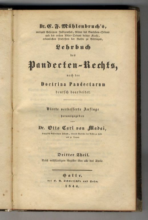 Lehrbuch des Pandekten-Rechts, nach der Doctrina Pandectarum deutsch bearbeitet. Vierte verbesserte Auflage herausgegeben von Dr. Otto Carl von Madai. Erster, Zweiter & Dritter Theil.