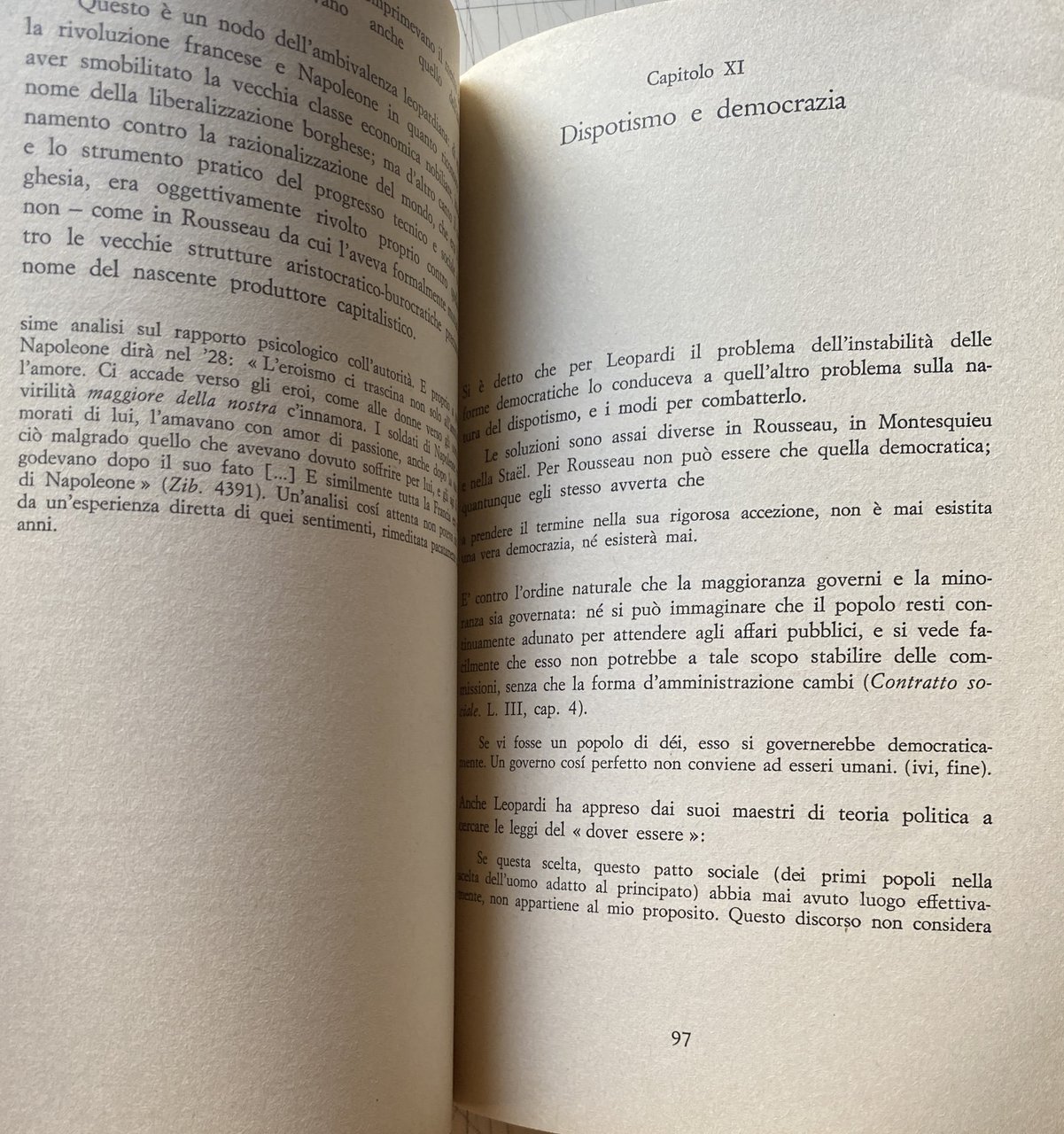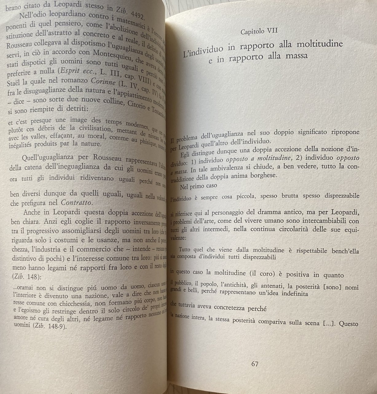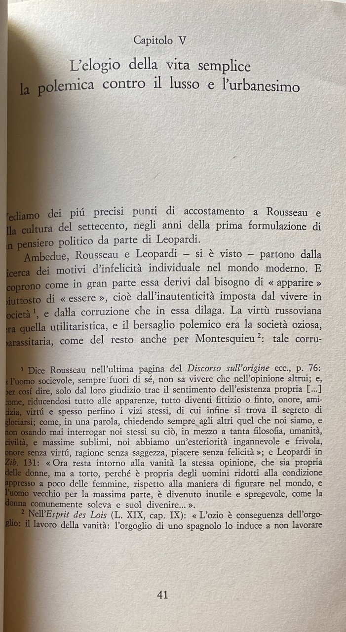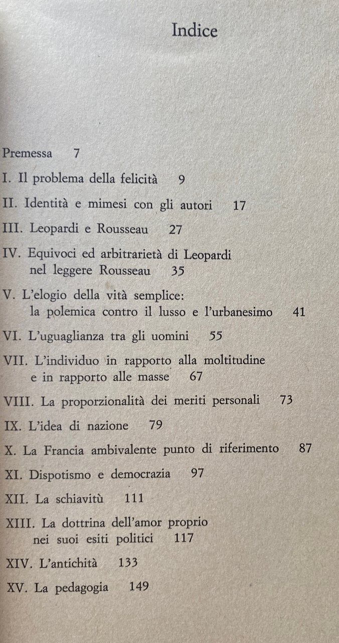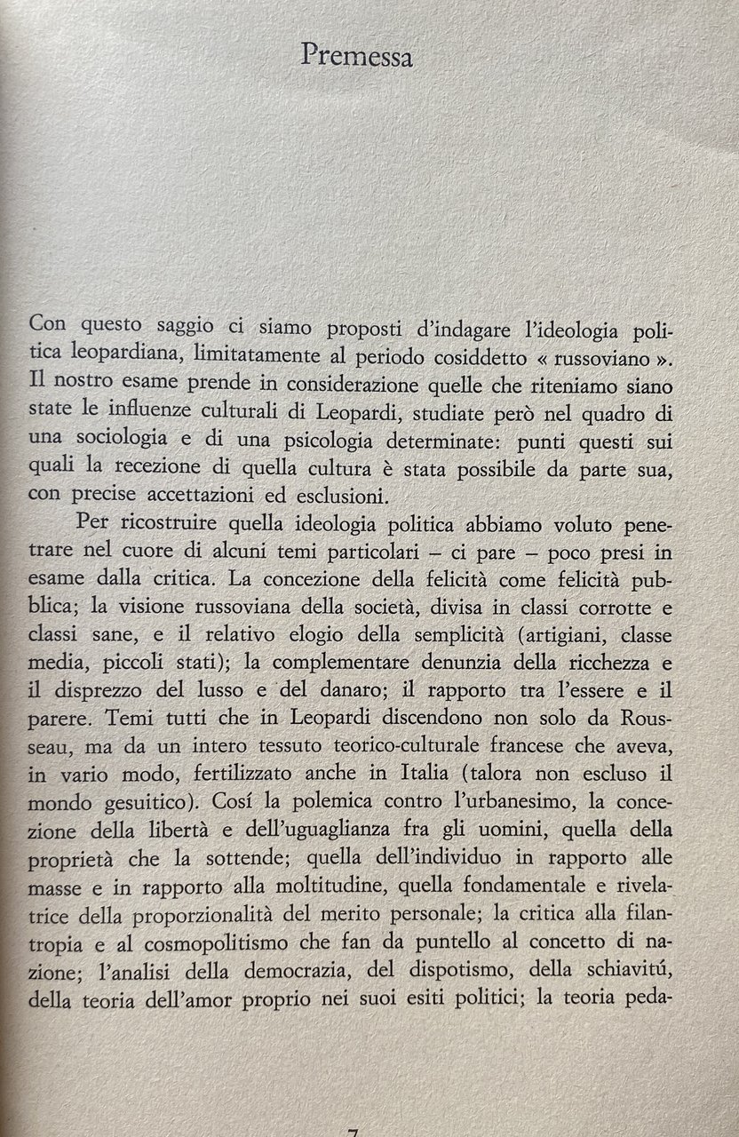 Soggetti: Critica letteraria Illuminismo Ideologie politiche Letteratura italiana Poesia Influenza Illuministi Pensiero politico Giovane Confronti Idéologues Studi leopardiani Antichi Bonheur Borghese Brancati Firenze Lecce Cabanis Carattere fallimentare Lusso Impegno Civile Clima Commercio Concetto Concezione Felicità Contratto sociale Costituzionale Amor proprio Democrazia Dispotismo Schiavitù Egoismo Pubblica Filosofia Dissertazioni filosofiche Fisiocratici Filantropia Cosmopolitismo Governo Grandeur hommes Ideologia Illusioni Individuale Individui Educazione Elogio Semplicità Uguaglianza Leggi Giacomo Leopardi Lettere Leopardiane Lettre Libertà Lucidità profetica Lusso Antonio Muratori Pietro Verri Gioacchino Murat Madame de Staël Max Ernst Moderno Mondo Montesquieu Morale Moltitudine Napoleone Natura Nazione Rousseau Nouvelle Héloïse Patria Pedagogia Polemica Urbanesimo Popolo primitivo Principio Problema Progresso Psicologico Ragione Rapporto Realtà Repubblica Rivoluzione francese Romanticismo Russoviana Russoviano Scienza Sentimento Settecento Sforzo Borghesia Società Storico Valore Virtù Vitaliano Brancati Volney Zibaldone Identità Mimesi Poetica Poesie Bruno Biral Operette morali Rosario Assunto Cesare Luporini Massimiliano Pavan Alfieri All'Italia Angelo Mai Arimane barbarie Walter Binni Canto Canzoni Carducci Civiltà Classici Costumi Crestomazia Cristianesimo Dialogo Discorso Ginestra Giordani Giudizio Grecia ideologica Infelicità Liberali Machiavelli Monaldo Monarchia assoluta Palinodia Paralipomeni della Batracomiomachia Perfezione Pessimismo Polemica Politica Recanati Religione Saggio Senofonte Spirito Tirannia Tirannide Vivere Bibliografia Riferimento Libri rari Vintage fuori catalogo Collezionismo Merito Ricchezza Corruzione Giorgio Candeloro Orazione Genovesi Letterati Intellettuali Restaurazione Trissino Delphine M.lle Albémar Pensées Esprit de Lois Semplicità Vita quotidiana Pensieri Confessioni Citazioni Nouvelle Heloise Corinne Emilio Gerratana Conciliatore Errori popolari Locke Literary criticism Enlightenment Political ideologies Italian literature Poetry Influence Thought Young Comparisons Leopardian studies Ancients Bourgeois Failure character Luxury Civil commitment Climate Commerce Conception Happiness Social contract Constitutional Self-love Democracy Despotism Slavery Selfishness Public Philosophy Philosophical dissertations Physiocrats Philanthropy Cosmopolitanism Government Ideology Illusions Education Praise Simplicity Equality Laws Letters Freedom Prophetic Luxury World Multitude Nature Nation Homeland Pedagogy Controversy Urbanism Primitive people Principle Problem Psychological Progress Reason Relationship Reality Republic French Revolution Romanticism Science Sentiment Eighteenth Century Effort Bourgeoisie Society Historical Value Virtue Identity Mimesis Poetics Poems Moral operettas Barbarism to Italy Singing Songs Civilization Classics Customs Chrestomazia Christianity Dialogue Speech Broom Judgment Ideological Greece Unhappiness Liberals Absolute Monarchy Palinody Paralipomena of the Batrachomyomachy Perfection Pessimism Controversy Politics Essay Xenophon Spirit Tyranny Living Bibliography Reference Rare books out of print Collectibles Merit Wealth Corruption Oration Literati Intellectuals Restoration Simplicity Daily life Thoughts Confessions Quotes Popular Mistakes