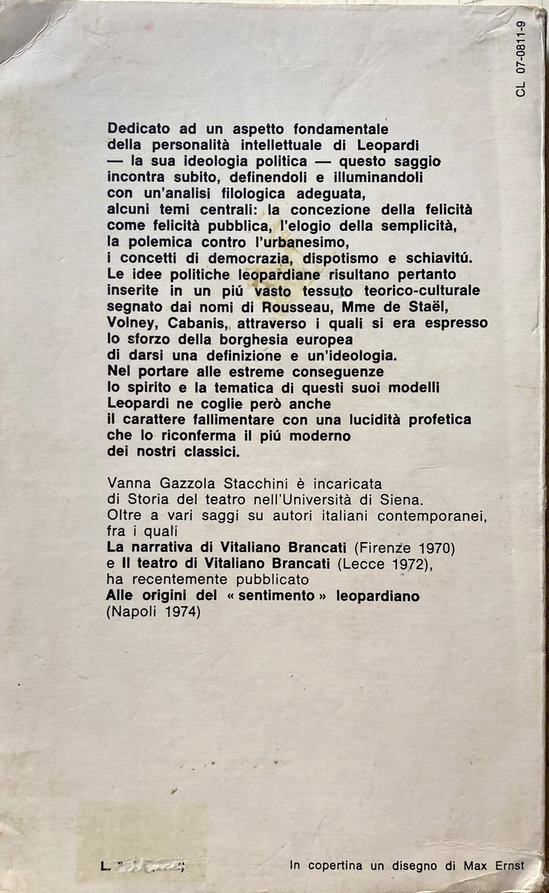 Dedicato ad un aspetto fondamentale della personalità intellettuale di Leopardi la sua ideologia politica questo saggio incontra subito, definendoli e illuminandoli con un'analisi filologica adeguata, alcuni temi centrali: la concezione della felicità come felicità pubblica, l'elogio della semplicità, la polemica contro l'urbanesimo, i concetti di democrazia, dispotismo e schiavitù. Le idee politiche leopardiane risultano pertanto inserite in un più vasto tessuto teorico-culturale segnato dai nomi di Rousseau, Mme de Staël, Volney, Cabanis, attraverso i quali si era espresso lo sforzo della borghesia europea di darsi una definizione e un'ideologia. Nel portare alle estreme conseguenze lo spirito e la tematica di questi suoi modelli Leopardi ne coglie però anche il carattere fallimentare con una lucidità profetica che lo riconferma il più moderno dei nostri classici.