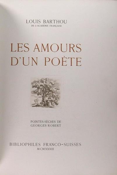 Bibliophiles Franco-Suisses, 1933, in/4, 237 pages, table, reliure en demi-maroquin vert à coins, doré sur tête, illustrations pointes sèches de Georges Robert. Exemplaire nominatif N° 25/110.