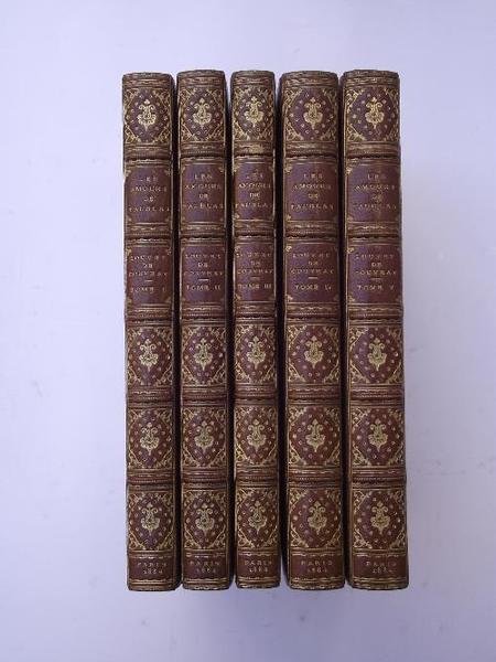 Cinque volumi di cm. 17,5, pp. 800 ca. complessive. Con 16 belle tavole incise all'acquaforte da Monziés da disegni di Paul Avril (ciascuna in doppio stato). Bella ed elegante legatura coeva in mezzo marocchino con ampie punte, dorsi a nervi con titoli e ricchi fregi in oro. Sguardie marmorizzate e tagli di testa dorati. (Legatura firmata Morrell binder London). Qualche marginale fioritura. Bell'esemplare, in barbe, fresco ed in ottimo stato di conservazione. Raffinata edizione impressa in 220 esemplari numerati. Il presente è il n. 17 nella tiratura su carta di Cina con tavole in due stati. Celebre opera edita originariamente nel 1791 che dipinge in maniera assai efficace la vita galante e libertina del '700. Cfr. Gay-Lemonnier.