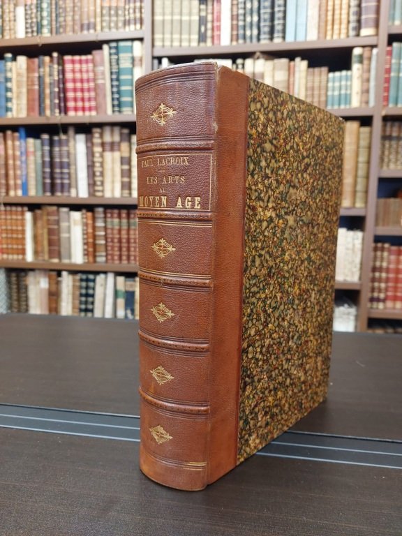 In-8° (cm. 28), legatura coeva in mezza pelle, titoli e fregi in oro al dorso, taglio superiore dorato, risguardi marmorizzati, pp. (4) IV 548 in barbe (leggere fioriture). Con facsimile di miniatura in antiporta, 400 incisioni xilografiche e 19 bellissime tavole in cromolitografia, eseguite da F. Kellerhoven. Seconda edizione. Ottimo esemplare. (NL8)