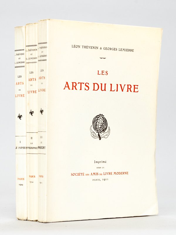 Un des 125 exemplaires, tous numérotés (exemplaire n° 28) et réservés exclusivement aux Membres de la Société des Amis du Livre, 3 vol. in-8 br., Imprimé pour la Société des Amis du Livre Moderne, 1909, 1910, 1911 Bon ensemble peu commun (le tirage fut limité à 125 exemplaires réservés aux membres de la société de bibliophiles des "Amis du Livre") tout à fait passionnant. Ainsi, le premier volume, consacré aux papiers, expose toute l'histoire et les techniques de fabrication des papiers de chine, papiers du japon et de hollande. Bon état (trace de trombone sur une couvertures, rouss. sur tranche sup., très bon état par ailleurs).