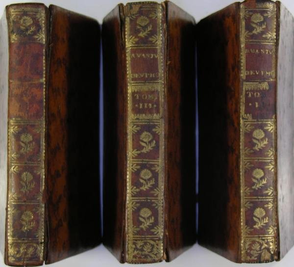 A Anvers, chez de Plantin, 1711. 3 volumes in-12 (16 x 9 cm) reliures plein veau tacheté du temps, dos lisses à caissons dorés, tranches rouges, vol. 1 : 10 f., 233 p. ; vol. 2 : 252 p. ; vol. 3 : 308 p., 2 f. d'errata. 1 feuillet manuscrit sur chaque volume en début ou en fin d'ouvrage (notes bibliographiques sur l'oeuvre originale de Barclay). Manque les pièces de titre du vol. 1 et partiellement sur le vol.2, 3 coiffes abîmées ; feuillets propres. Euphormion de Jean Barclay (1582, Pont-à-Mousson - 1621, Rome - écrivain français d'origine écossaise du premier quart du XVIIe siècle. Il est l'un des derniers humanistes, un "homo europeanus") est un récit satirique néo-latin publié en 1605-1607. "Il existe plusieurs manières de comprendre ce texte mal connu, qui a pourtant constitué un grand succès littéraire européen à travers ses nombreuses éditions : on peut l’envisager comme une réécriture des modèles antiques de récits satiriques, Pétrone et Lucien en premier lieu, le situer dans le prolongement du picaresque espagnol, ou encore le placer dans la lignée du roman rabelaisien".( in"Vérité et fausseté de l’apparence : le jeu de l’enseignement allégorique et du renversement anamorphique dans les fictions satiriques au XVIIe siècle ")