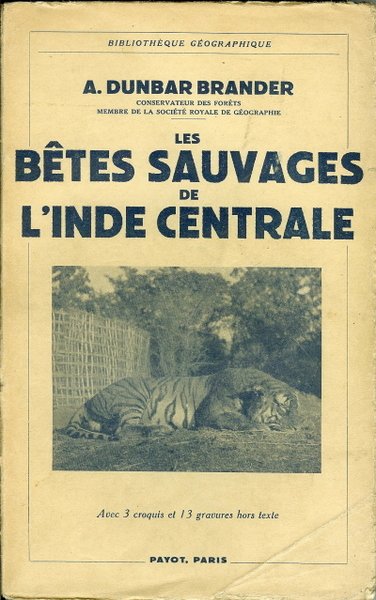Payot, Paris, 1941. Grand In/8 broché, couverture illustrée, 305 pages, ouvrage orné de 3 croquis et 13 gravures hors-texte sur papier couché. A. Dunbar-Brander décrit ici les habitudes, caractères, ainsi que les relations mutuelles des animaux les plus importants des Provinces Centrales de l’Inde : ours, chien sauvage, tigre, cerf, antilope, sanglier, etc. Edition originale. Mouchon, 1074.