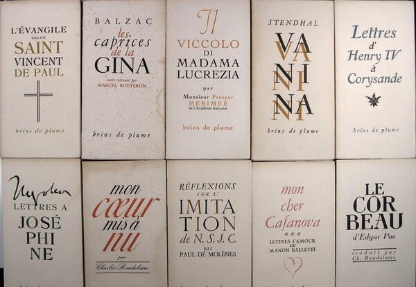 Maxilien Vox, 1944/1945, Collection "Brins de Plume", In/6 broché, oblong, couverture remplié, tirage mille exemplaires sur B.F.K. Rives tiré pard Daniel-Luxe à Lille pour Union Bibliophile de France, tirage numéroté. N° 1 Les Caprices de la Gina, par H. de Balzac, texte retrouvées par Marcel Bouteron, 63 pages (tache sur la couverture) - N° 2.- Viccolo di madama Lucrezia, par Mérimée 74 pages - N° 3 Vanina Vanini : chronique italienne, par Stendhal, 80 pages - N° 4 Lettres de Napoléon à Joséphine, 56 pages - N° 5 L'Évangile selon Saint Vincent de Paul d'après les entretiens spirituels, 56 pages - N° 6 Mon cher Casanova : lettres d'amour, de Manon Balletti, 58 pages - N° 7 Le Corbeau, par Edgar Allan Poe ; traduit par Ch. Baudelaire, 58 pages - N° 8 Réflexions sur l'Imitation de N.S.J.C., par Paul de Molènes ; (préf. de Barbey d'Aurevilly et postface par le général du Barail) 56pages - N° 9 - Lettres d'Henry IV à Corysande : 1585-1597, 56 pages - N° 10 Mon coeur mis à nu : journal intime, par Ch. Baudelaire, 69 pages.