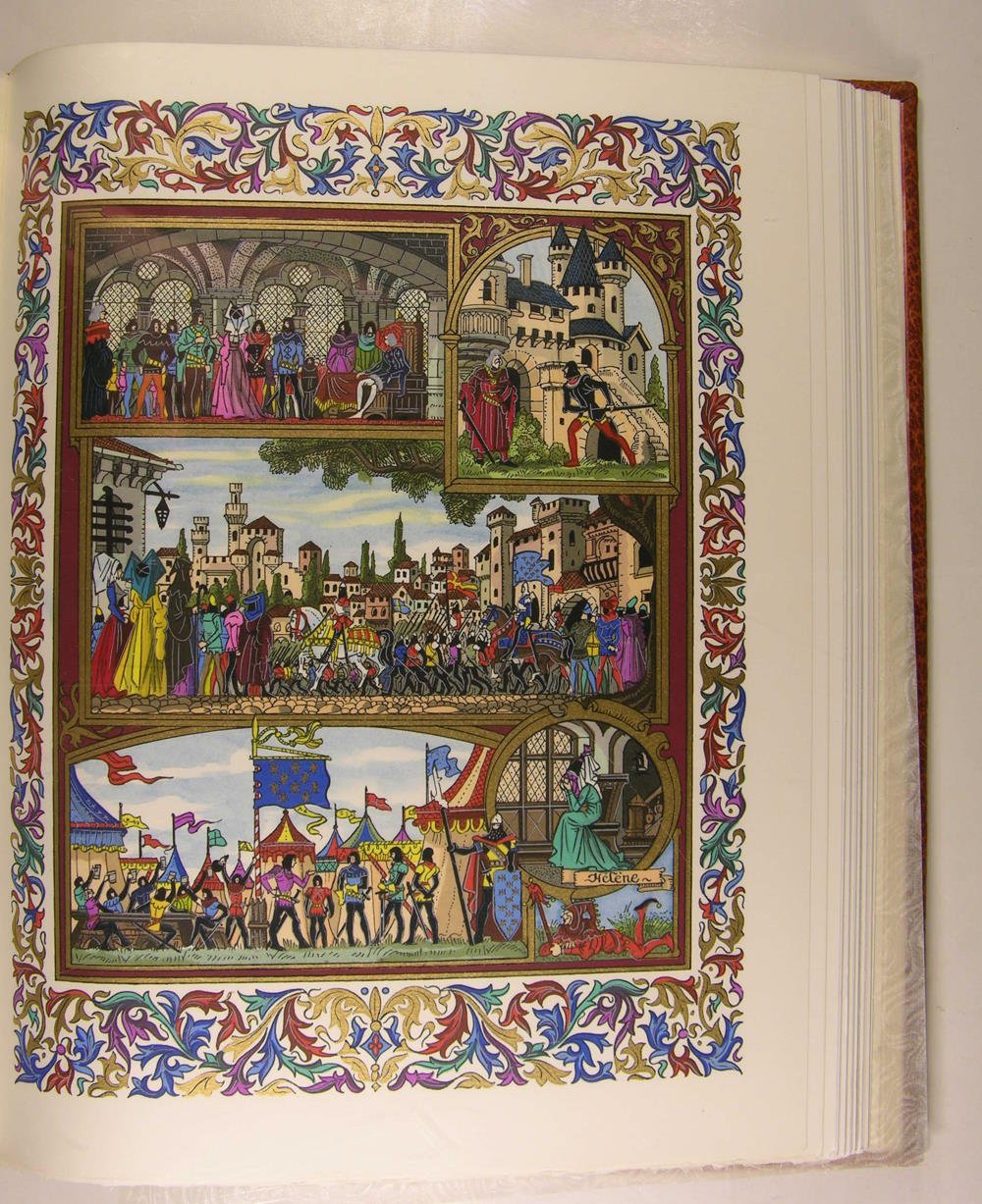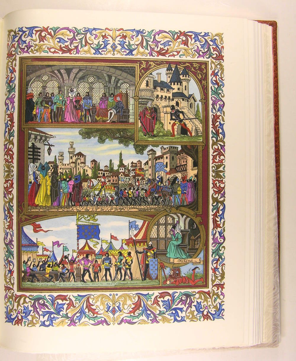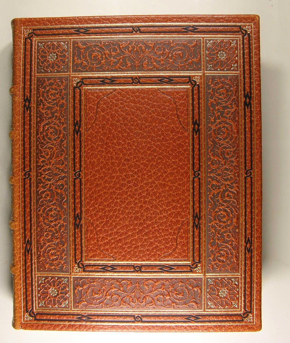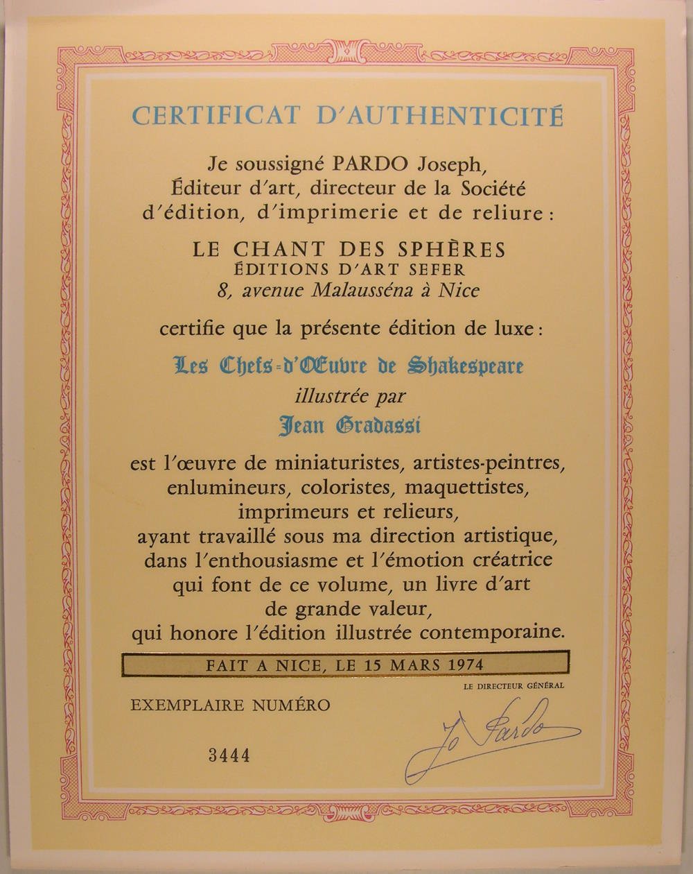 A l'enseigne du Chant des Sphères au 22 de l'avenue Borriglione à Nice, 1969-1974. 12 volumes, première et deuxième série, in/4, cuir havane, plats entièrement recouverts d'un décor floral poussé à froid à la plaque, rehaussé de filets et fleurons dorés, rappel du décor sur les dos à nerfs; doublures et gardes de papier marbré, têtes dorées, non rognés. Étuis (reliures de l'éditeur), Dos passés. Très belle édition illustrée par Jean Gradassi de miniatures coloriées au pochoir et rehaussées à l'or et au palladium, dont 2 frontispices sur double page, 72 miniatures hors texte, 72 bandeaux, et de nombreux culs-de-lampe. Tirage limité à 3.530 exemplaires numérotés. 3444. Exemplaire complet du certificat d'authenticité de l'éditeur. Avec une suite en vert anglais de 6 planches,et une aquarelle originale, parmi les 420 exemplaires numérotés de 181 à 600. Traduction de F. Victor Hugo. La Mégère apprivoisée. Roméo et Juliette. 1 volume - Hamlet. Le Songe d'une nuit d'été. 1 volume - Le Marchand de Venise. Othello. 1 volume - Macbeth. Le Roi Lear. 1 volume - Coriolan. Les Joyeuses Commères de Windsor. 1 volume - Richard III. Henry VIII. 1 volume - Les Deux Gentilshommes de Vérone. Antoine et Cléopâtre. 1 volume - Le Soir des rois. Henry V. 1 volume - Peines d'amour perdues - Richard II. 1 volume - Comme il vous plaira. Mesure pour mesure. 1 volume - Beaucoup de bruit pour rien. Jules César. 1 volume - Le Roi Jean. Tout est bien qui finit bien.