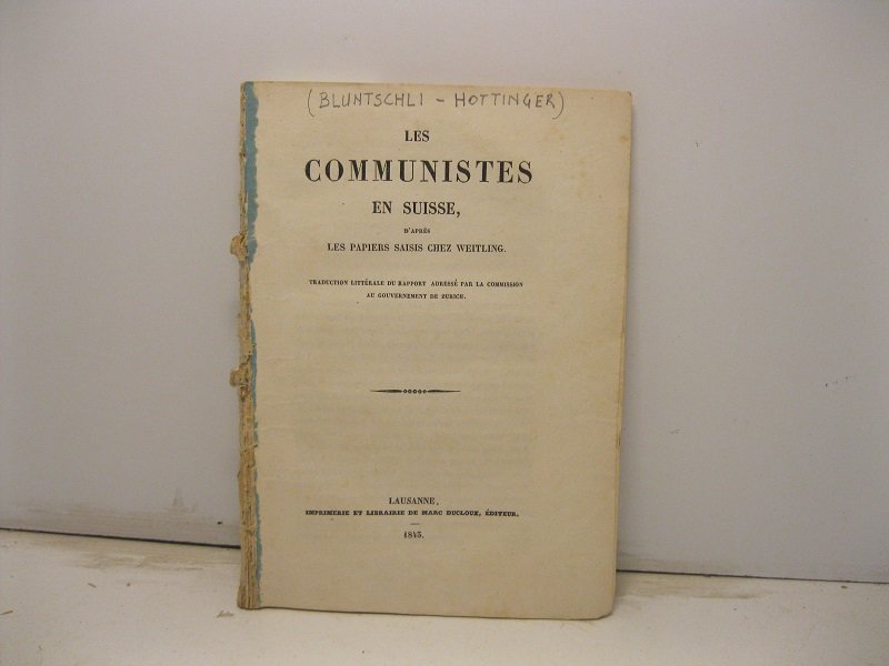 In 16, pp. 123 + (1b). Br. rifatta con carta d'epoca. Rarissima opera di Johann Kaspar Bluntschli (1808-1881), professore di diritto pubblico a Zurigo, seguace della scuola del Savigny, poi uomo politico dalle idee fortemente conservatrici che qui redige un rapporto sullo stato del Comunismo in Svizzera ponendo Weitling e tutto il movimento in una luce sinistra. Per Bluntschli il comunismo minava le fondamenta dell'ordinamento politico nonche' la liberta' privata perche' rovesciava il potere dello Stato a favore della Comune. Le armi del Comunismo erano i tumulti e le manifestazioni popolari, la cospirazione ed uno stato di agitazione continua e generale.
