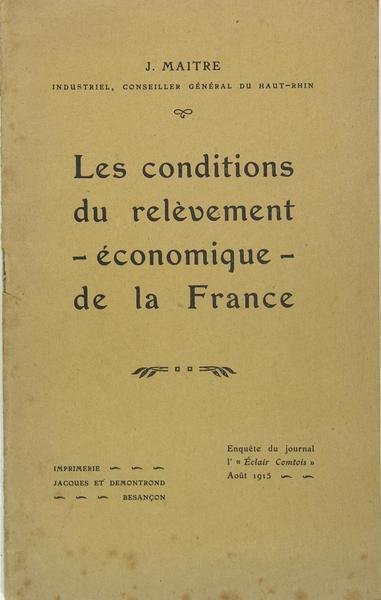 Imprimerie Jacques et Demontrond, Besançon, 1915. Plaquette in/8 (22 x 14 cm) brochée, couverture imprimée, 27 pages. Rousseurs sur la couverture. L'auteur (né en 1861) , industriel qui oeuvra dans la société Vieillard Migon et cie (Morvillard), fut Président de la Chambre de Commerce de Belfot et conseiller général du Haut Rhin.