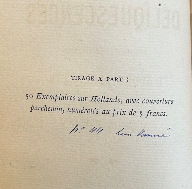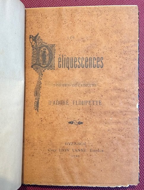 In-16° (165 x 110 mm.), pp. XLVII, 77, (3), legatura in mezza pelle dell'epoca, titolo e fregi in oro al dorso, brossura editoriale conservata. Seconda edizione, in parte originale, intitolata Vanier, e completata la stampa il 20 giugno 1885, una delle 50 copie numerate e giustificate di Hollande di Lion Vanné con la brossura in pergamenina. Il nostro è l'esemplare n. 44 firmato dall'editore. Adoré Floupette è lo pseudonimo collettivo degli autori francesi Henri Beauclair e Gabriel Vicaire utilizzato per la loro parodia letteraria del 1885 intitolata 'Les Déliqueescences d'Adoré Floupette', una raccolta di poesie che satirizzano il simbolismo francese e il movimento decadente