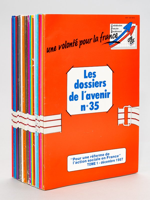 26 numéro in-4 br., Les Dossiers de l'avenir. Une volonté pour la France (26 numéros : Du n° 1 au n° 21 et n° 29, 30, 32, 33, 34, 35. Années 1985, 1986, 1987) 1 : Vérité pour demain juin 1985 : 2 : L'économie sociale juin 1985 ; 3 : Faut-il dénationaliser ? juin 1985 ; 4 : Pour une nouvelle politique salariale juillet 1985 ; 5 : Poids et répartition des cotisations sociales juillet 1985 ; 6 : Pour un nouveau concept du temps de travail août 1985 ; 7 : Le pluralisme syndical août 1985 ; 8 : La modernisation industrielle de la France Tome 1 ; 9 : La modernisation industrielle de la France Tome 2 Septembre 1985 ; 10 : La modernisation industrielle de la France Tome 3 Septembre 1985 ; 11 : L'Enjeu octobre 1985 ; 12 : La protection sociale complémentaire Tome 1 novembre 1985 ; 13 : La protection sociale complémentaire Tome 1 novembre 1985 ; 14 : Pour sauvegarder la sécurité sociale Tome 1 Décembre 1985 ; 15 : Pour sauvegarder la sécurité sociale Tome 2 Décembre 1985 ; 16 : Civilisation et nouvelles technologies Janvier 1986 ; 17 : Le financement de l'économie février 1986 ; 18 : Pour une nouvelle organisation du système éducatif mars 1986 ; 19 : Retraite et pré-retraite avril 1986 ; 20 : Partenariat et participation mai 1986 ; 21 : La réforme du droit des licenciements économiques juin 1986 ; 29 : La famille - Quel constat ? Tome 1 avril 1987 ; 30 : La famille - Quelles solutions ? Tome 2 mai 1987 ; 32 : Pour une réforme de l'impôt sur le revenu. Septembre 1987 ; 33 : Etats généraux de la Sécurité Sociale octobre 1987 ; 34 : Le travail des salariés français à l'étranger novembre 1987 ; 35 : Pour une réforme de l'action sociale n France décembre 1987 Ensemble peu commun de dossiers destinés à la formation des cadres de la C.G.C., provenant de la bibliothèque d'un ancien sénateur-maire. Prix du lot, non séparable.