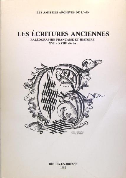 Bourg en Bresse, les Amis des archives de l'Ain, 1982. In-4 (30 x 21 cm) broché, couverture illustrée en noir, 63 pages, 29 documents anciens sur l'Ain reproduits. Une trace de pliure sur la couverture. Un bon outil pour apprendre à déchiffrer les documents manuscrits anciens.