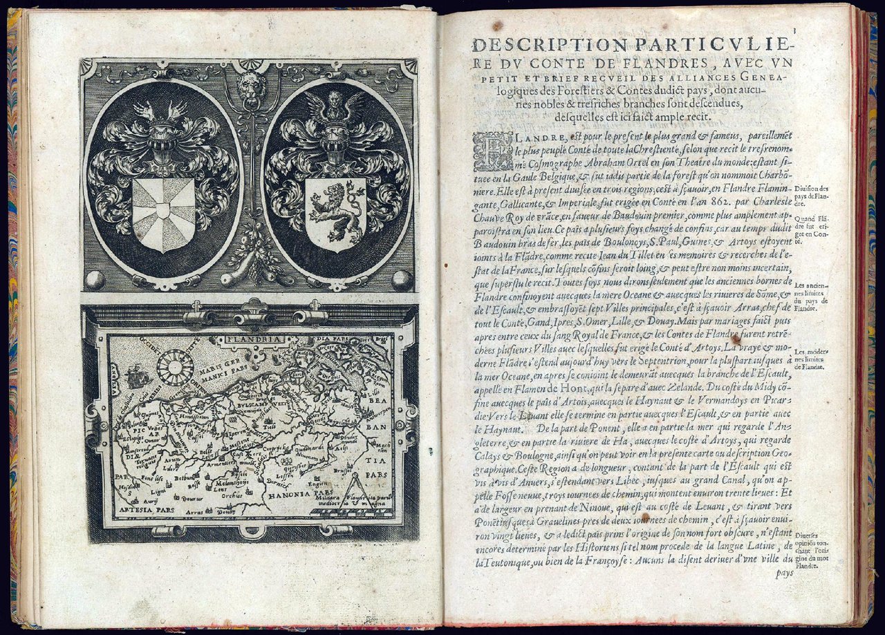 In folio (mm. 273x178). Pp. [6], 119, [3]. Segnatura: A-Q4. Le illustrazioni calcografiche includono: il titolo inciso; una tavola di dedica all'arciduca Mattia d'Asburgo, figlio dell'imperatore Massimiliano II, con le armi dello stesso; una tavola che reca due stemmi ed una carta geografica delle Fiandre; 40 ritratti a piena pagina così numerati: Forestiers (1-7), Contes de Flandre (1-33); una tavola allegorica della morte con sotto un poema di Charles de Navières. Nel testo numerose iniziali e stemmi xilografici. Cartone marmorizzato posteriore, titolo su tassello al dorso, tagli rossi. Al contropiatto ex-libris dei Conti Lamberti. Uniformemente brunito, piccoli fori tondi alle ultime carte, ma esemplare genuino e non smarginato.