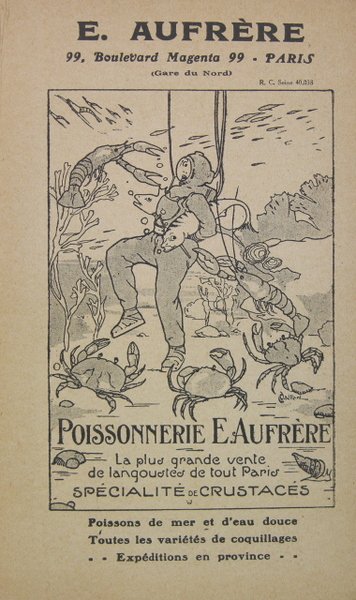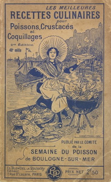 Comité National de Propagande pour la Consommation du Poisson, Paris, 1924. In/8 broché, couverture illustrée, figures en noir dans le texte. 118 pages. Méthodes de cuisson, les sauces pour accompagner le poisson, soupes, utilisation des restes de poissons, recettes spéciales pour chaque poisson, poissons salés, fumés, conserves en boîte, oeufs et laitances de poissons, coquillages, crustacés, etc.