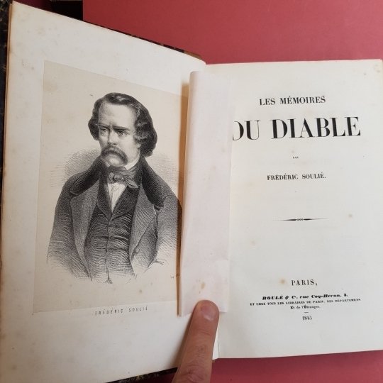 In-8°, pp. 644, ritratto dell'autore in litografia in antiporta, mezza pelle dell'epoca, titolo su tassello al dorso. Bel ex-libris nobiliare al piatto interno. Frédéric Soulié (Foix, 23 dicembre 1800 – Bièvres, 23 settembre 1847) è stato uno scrittore francese, considerato insieme a Honoré de Balzac, Eugène Sue e Alexandre Dumas uno dei quattro grandi autori di romanzi popolari della Monarchia di Luglio. Nel 1828 scrisse il dramma Romeo e Giulietta, cui seguì nel 1829 Cristina a Fontainebleau. Nel 1838 pubblicò la sua opera più importante, il romanzo Le memorie del diavolo.