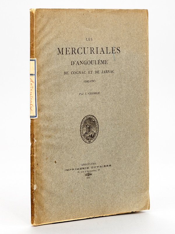Extrait du Bulletin de la Société Archéologique et historique de la Charente, année 1919, tiré à 125 exemplaires, 1 vol. in-8 br., Imprimerie Ouvrière, Angoulême, 1921, 94 pp. Rare tiré à part (tirage à seulement 125 exemplaires) détaillant les "mercuriales" ou états du prix des grains vendus au marché. "Elles permettaient au personnel politique de juger de la récolte ; au personnel de la police de s'assurer si la vente du pain avait lieu conformément aux tarifs établis ; aux particuliers de régler leurs comptes et de simplifier leurs procès". Et on ne dira rien de leur immense intérêt pour l'historien ! Etat très satisfaisant (étiquette contrecollée en dos, bon état par ailleurs)
