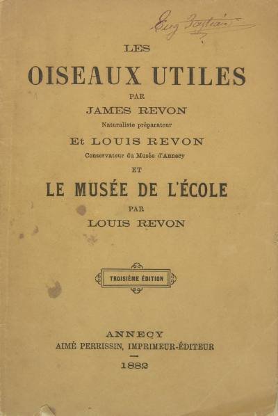 Aimé Perrissin, Annecy, 1882. Plaquette In/12, 32 p., troisième édition. Les oiseaux “utiles”, mais aussi quelques mammifères, reptiles et insectes.