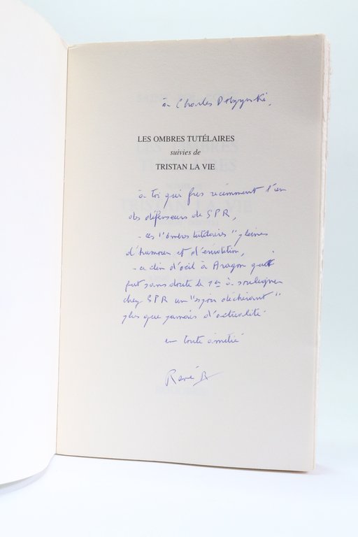 Rougerie | Mortemart 2005 | 14 x 22.50 cm | broché | [ENGLISH DESCRIPTION ON DEMAND] | Edition originale, un des exemplaires sur bouffant. Agréable exemplaire. Bel envoi autographe signé de René Rougerie à Charles Dobzynski : A toi qui fut récemment un défenseur de SPR, ces ombres tutélaires pleines d'humout et d'émotion, en clin d'oeil à Aragon qui fut sans doute le 1ert à souligner chez SPR un espoir déchirant plus que jamais d'actualité. En toute amitié.
