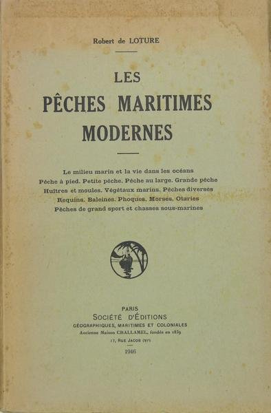 Paris, Société d’éditions géographiques, maritimes et coloniales, 1946. In/4 broché, couverture imprimée, 374 pages. Exemplaire non coupé. Rousseurs sur la couverture. Le milieu marin et la vie dans les océans, pêche à pied, petite pêche, pêche au large, grande pêche, huîtres et moules, végétaux marins, pêches diverses, requins, baleines, phoques, morses, otaries, pêche de grand sport et chasses sous-marines.