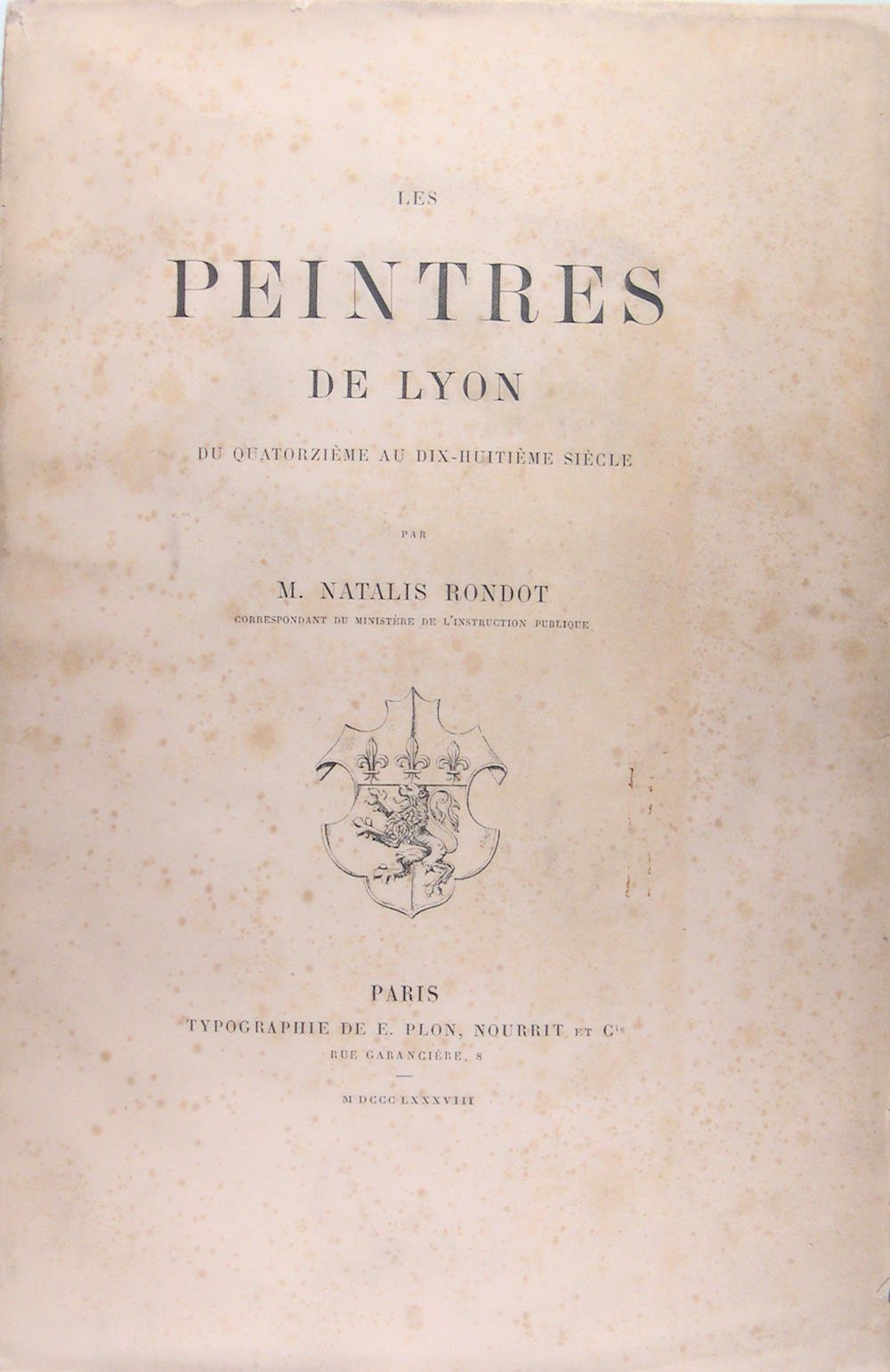 Plon, Nourrit, Paris, 1888. In-4 broché, couverture imprimée, 242 pages. Brochages avec rousseurs et fragilités, exemplaire non coupé. Les peintres et les enlumineurs de Lyon avec leurs biographies et le cas échéant leurs signatures.