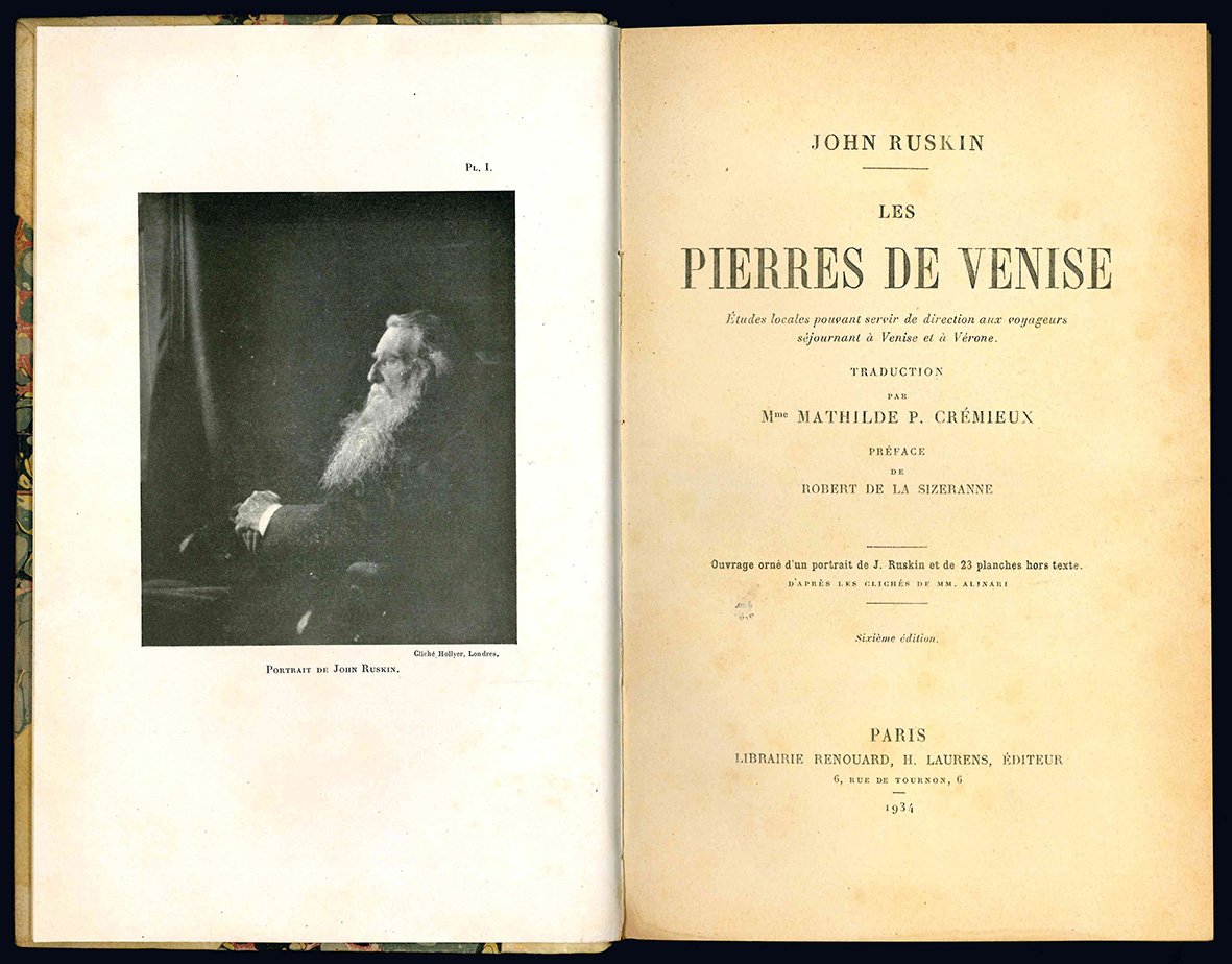Les pierres de Venise. Etudes locales pouvant servir de direction aux voyageurs séjournant à Venise et a Vèrone. Traduction par Mme. Mathilde P. Crémieux. Preface de Robert de la Sizeranne. Sixième édition.