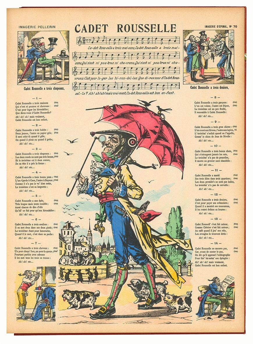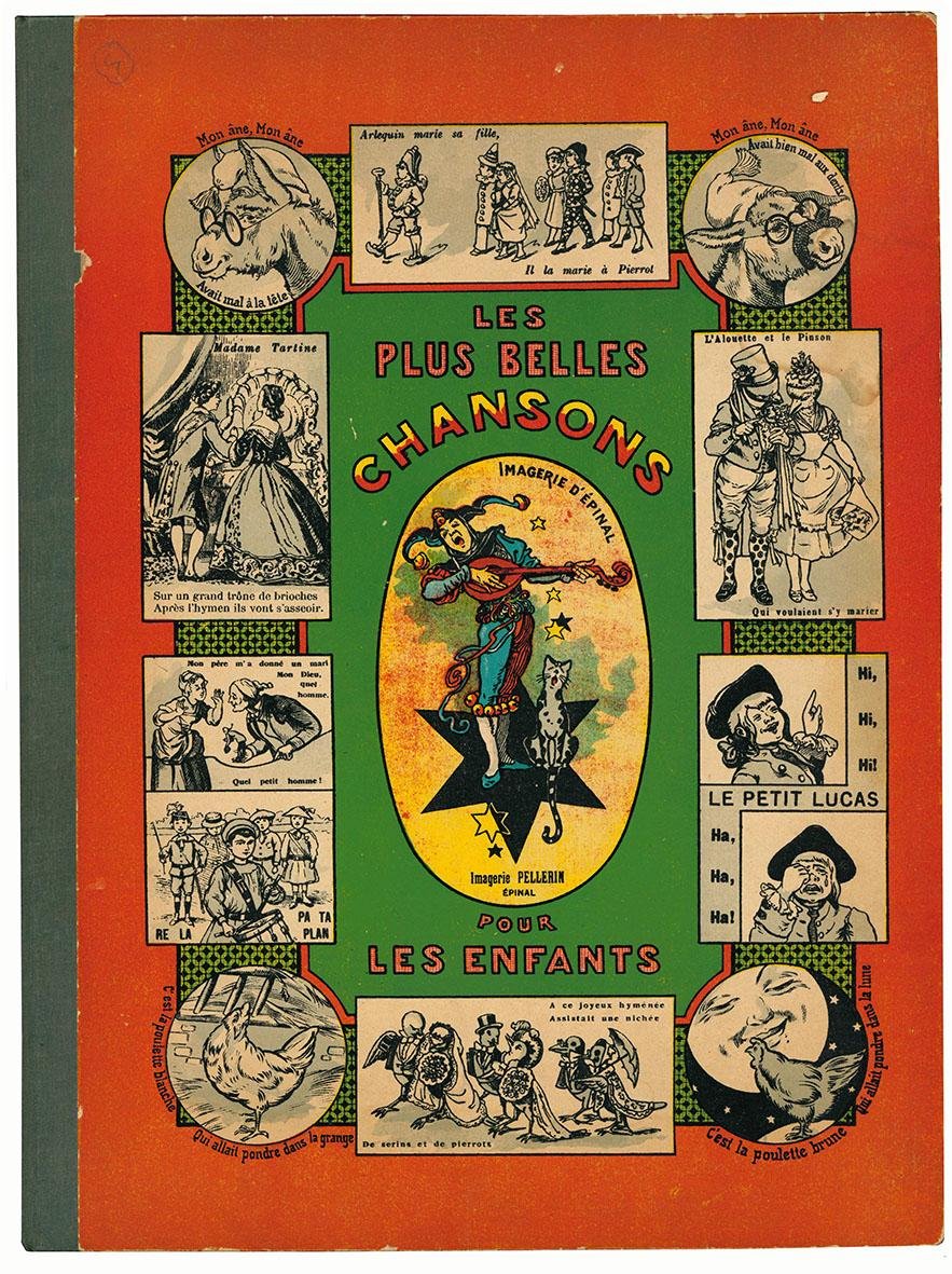 In folio (mm 380x280); 40 c. di tav. a colori stampate al recto. Raccolta illustrata di canzoni da ragazzi, per lo più ronde, allegri e canzonette comiche. Ogni tavola contiene il testo in musica, le parole e le belle illustrazioni a colori, tipiche dell'Imagerie: Cadet Rousselle, La Bergère et son chat, Il pleut bergère, Baffrelard, L'Ange gardien, Sur le Pont d'Avignon, Le petit poisson, Frère Jacques. Carta uniformemente brunita. Mezza tela editoriale con illustrazioni a colori ai piatti. Minime mancanze ai margini esterni dei piatti.