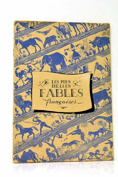 14 fauilets. (26x18,5 Cm). Broché avec agrafes, jolies couvertures cartonnées; le titre sur la première où figurent en silhouettes bleues, les personnages et animaux des fables. Quelques taches. Poljan, Bovis et Chaillot illustrent cette brochure populaire dans le style des bandes dessinées , sans les bulles, à raison de 9 images par page, on retrouve : 12 fables de La Fontaine et 12 fables de Florian (dont le Singe qui montre la Lanterne Magique). Très bon exemplaire.