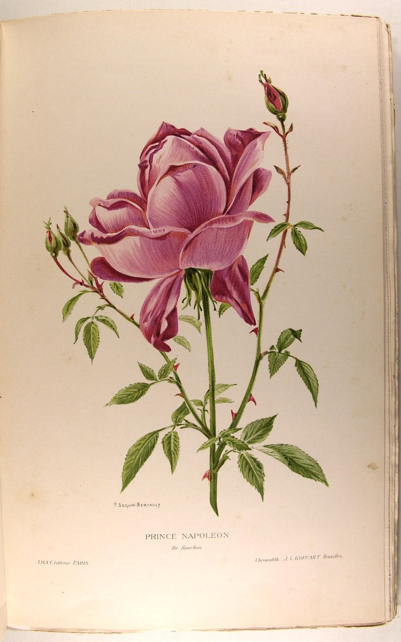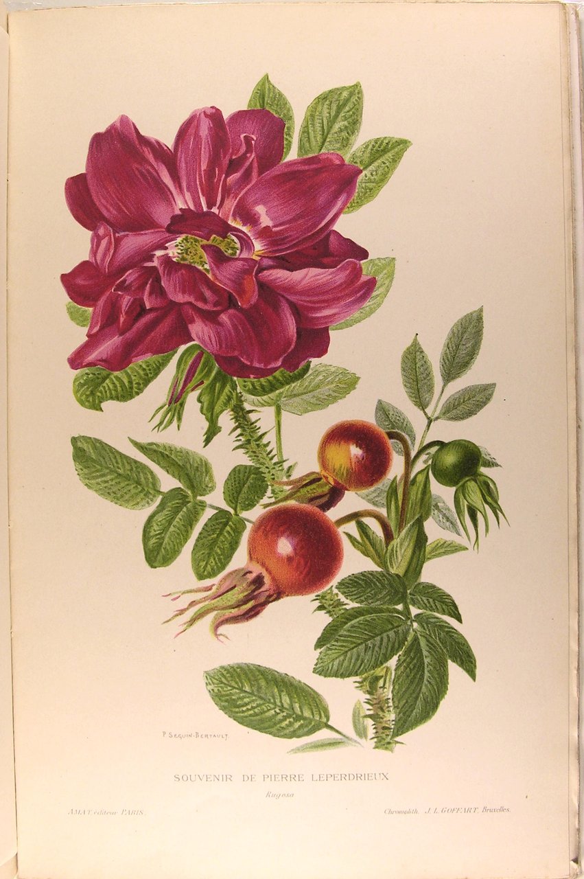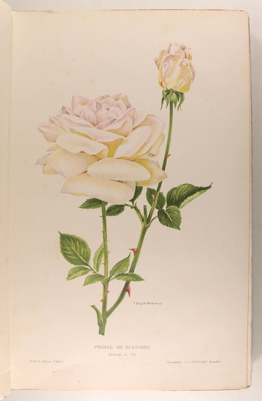 Paris, Charles Amat libraire éditeur, s.d. (1912). In/4 broché, couverture illustrée, illustrations 18 planches (16 en chromo, 2 en sanguine - la plupart signée Séguin-Bertault), illustrations in-texte, planches photographiques, plans de roseraies, 235 p. Petits défauts en bordure de couverture ; petit manque en base du dos.Description du rosier, roses botaniques, catalogue, cultures, taille, angrais, insectes, maladies, fécondation artificielle, emplois en jardin et dans la maison.