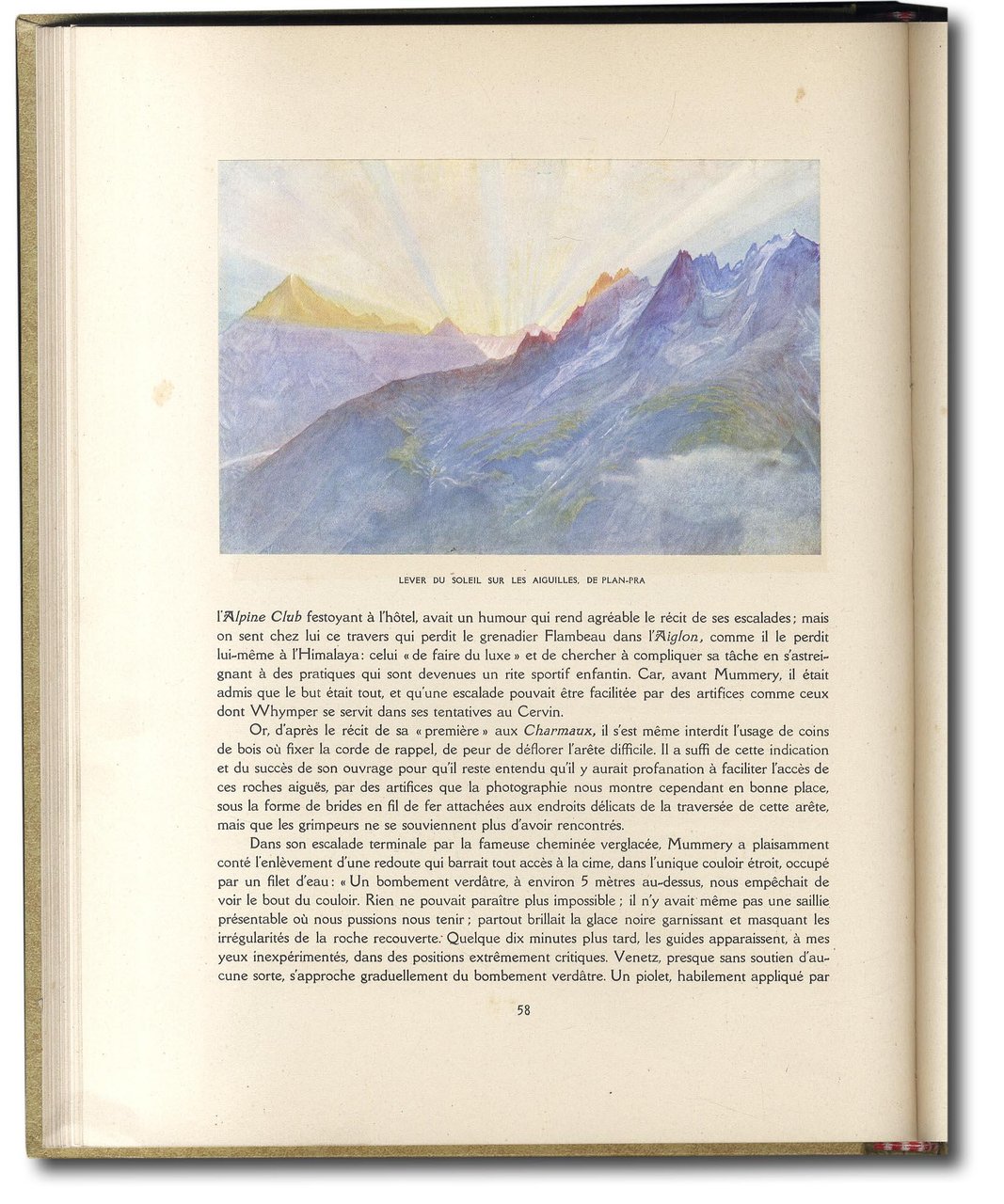 >in-4, pp. (4), 128, leg. moderna in similpelle color crème, tass. in pelle con tit. oro al dorso, copert. edit. cons. Prima edizione di quest'opera di notevole fascino e pregio iconografico, essendo illustrata da 128 acquerelli e disegni a colori o seppia n.t. e 10 tavole f.t. Esemplare n. 25 della tiratura comune, senza la doppia suite delle illustrazioi. Ottimo esemplare a pieni margini. Perret 1112: «Superbe album sur le Mont-Blanc. Un des plus beaux livres parus sur la chaîne du Mont-Blanc, peu courant et très recherché en édition originale...». ACL 76.