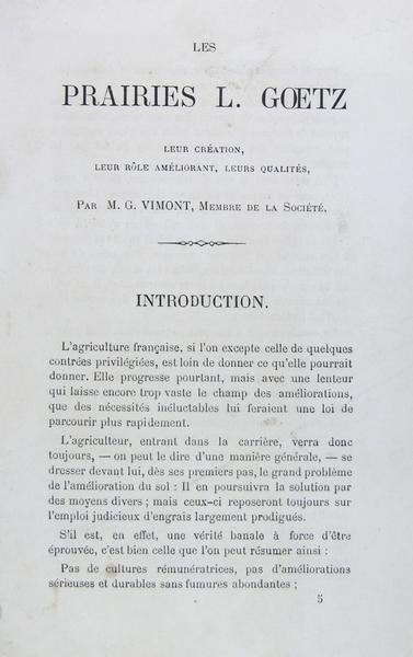 s.l. (Annales de la Société d'agriculture de la Marne, 1880-81). In-8 (23 x 14 cm) broché en couverture d'attente, 197 pages. Écrits en page de garde et sur la p.110. Préconisée dés le 16è par O. de Serres, la prairie temporaire n'a été qu'assez rarement pratiquée en Europe, jusqu'au début du 20è. A la fin du 19è siècle, à la suite des essais faits par l'auteur du présent ouvrage, on pratiqua le retournement et le resemis d'espèces fourragères pour une culture de durée limitée, mais en raison de leur dégradation rapide, ces praireies furent fort critiquées par les agronomes (Boitel, Berthault, Heuzé). Cependant, l'extension de la prairie temporaire en France (et en Europe) n'est donc que très récente. Son succès relatif est imputable, sans aucun doute : à une maîtrise meilleure des techniques d'implantation, d'exploitation et de fertilisation de cette prairie; ainsi qu'à la création, par sélection, d'un matériel végétal amélioréinexistant jusqu'alors, notamment de variétés de précocité échelonnées, assurant un meilleur étalement de la production printanière. (in "La prairie temporaire")