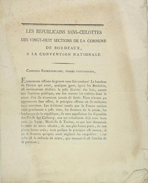 Les Républicains Sans Culottes des vingt huit sections de la commune de Bordeaux, à la Convention Nationale