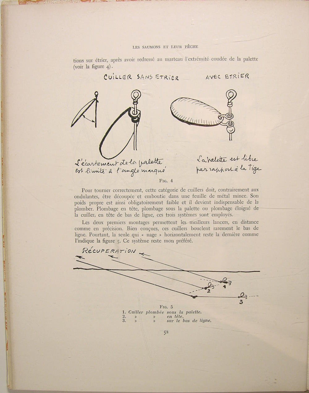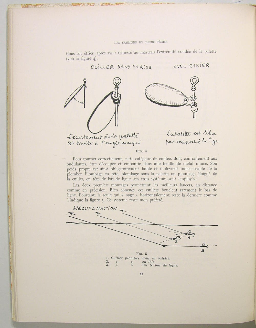 Crépin-Leblond et Cie Editeurs, 1964. In/4, couverture cartonnée illustrée de saumons, 162 pages. Figures et nombreuses photographies en noir et blanc. En préambule une petite monographie du saumon. Il présente les eaux à saumons d’Europe. Les pêches au spinning. Le matériel. Les lancers et l’action de pêche. Le saumon à la cuisine et sur la table.