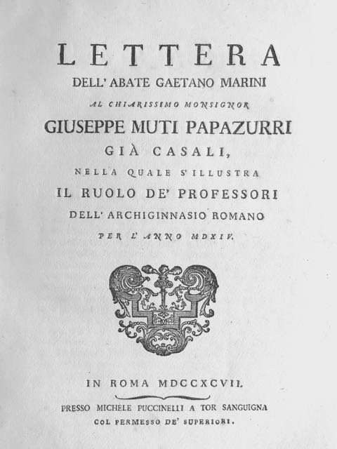Lettera al chiarissimo monsignor Giuseppe Muti Papazurri già Casali, nella quale s'illustra il ruolo de' professori dell'Archiginnasio Romano per l'anno 1514.