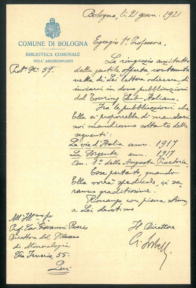<p>20x13 cm, 18 righe su carta intestata dell'Archiginnasio dove ringrazia Giovanni Boeno, direttore del museo di mineralogia di Bologna. "tra le pubblicazioni che Ella si proporrebbe di mandarci ci sono indicazione di 3 raccolte di riviste.".</p>