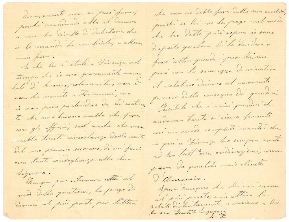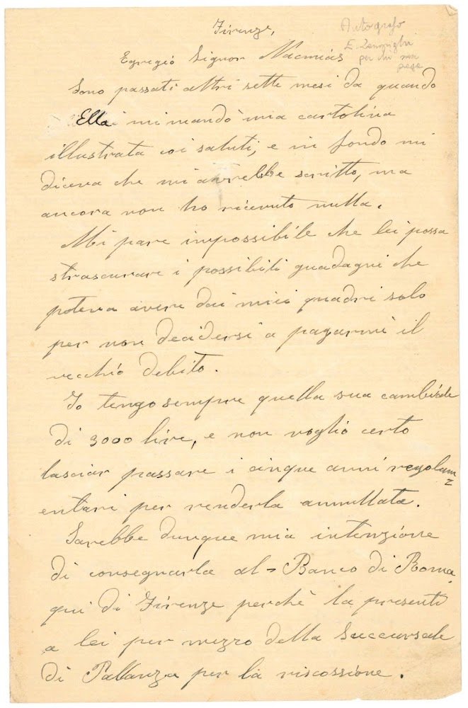 Bifolio di mm. 209x135. Zampighi scrive da Firenze in merito ad una cambiale del Nacmias che vorrebbe depositare presso il Banco di Roma, non avendo quest'ultimo pagato un vecchio debito. Si chiede inoltre come sia possibile che il Nacmias non venda più i suoi quadri, per i quali c'è invece molta richiesta a Firenze ed anche oltreoceano.