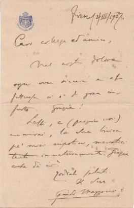AUTOGRAFOLa missiva è scritta poco dopo la morte dei giovanissimi nipoti: "[…] nel nostro dolore ogni voce sincera e affettuosa ci è di gran conforto […]. Lessi […] la sua lirica pe' miei nipotini, mancatici tanto prematuramente […]".
