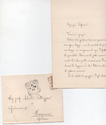 Lettera autografa firmata, datata 21 gennaio 1906 - Torino, inviata al professor Achille Pellizzari - Ginnasio di Sarzana