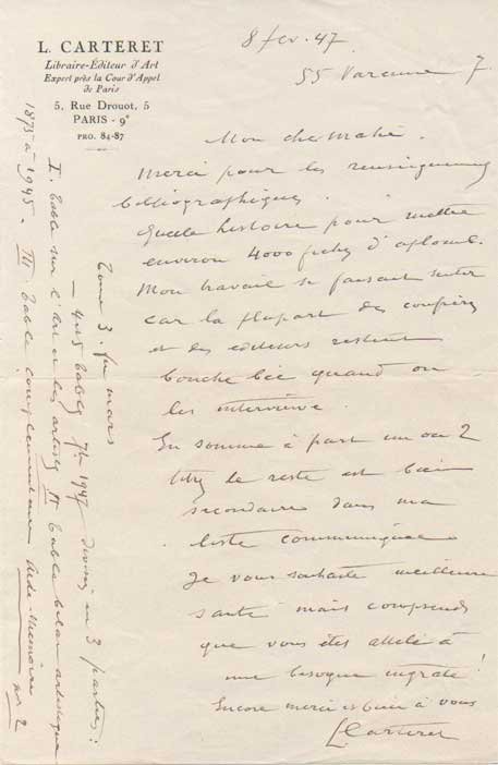 - 210x135 mm. 1 carta, scritto il recto. Manoscritto a penna nera su carta intestata " L. Carteret / Libraire-Editeur d'Art / Expert près de la Cour d'Appel de Paris / 5 Rue Drouot, 5 / Paris ". Busta con francobollo conservata, ma senza timbro postale.